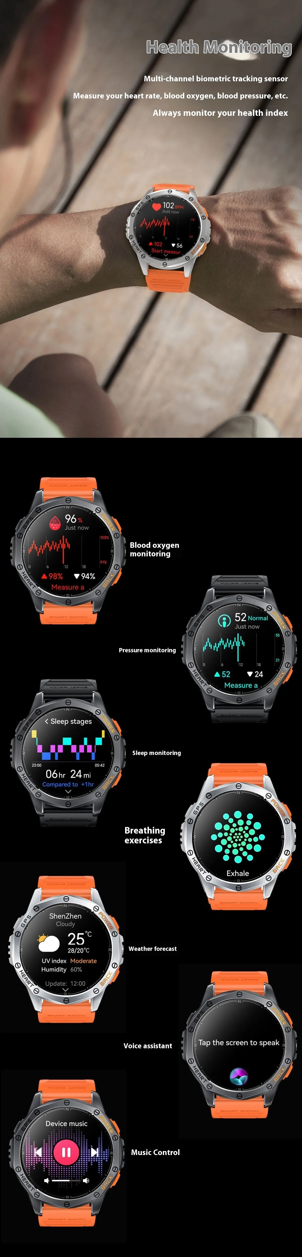 Health and Fitness Tracking: Includes heart rate monitoring, step counting, sleep tracking, and more to help you stay on