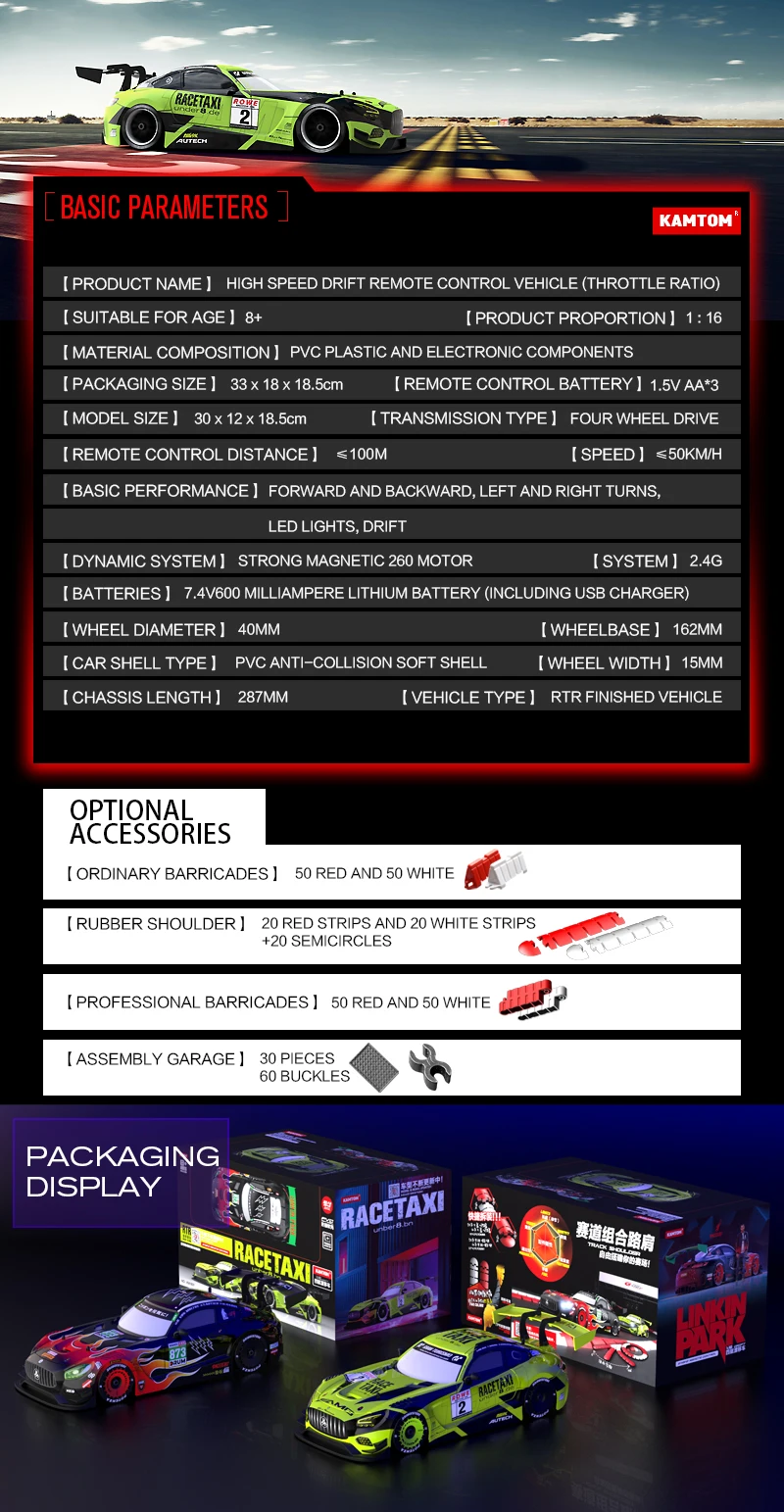 Introducing the KAMTOM High-Speed Drift RC 4WD 1:16 2.4G Remote Control Car, a top-tier electric toy designed for enthusiasts aged 14 and above. This high-performance model offers an exhilarating racing experience with its sleek design and advanced features. Whether you're a seasoned RC hobbyist or a newcomer eager to dive into the world of remote-controlled vehicles, this car promises hours of fun and excitement.