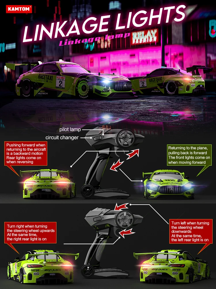 For added realism and flair, the KAMTOM RC car features LED lights that illuminate during operation. These lights enhance the visual appeal, especially during night-time races.