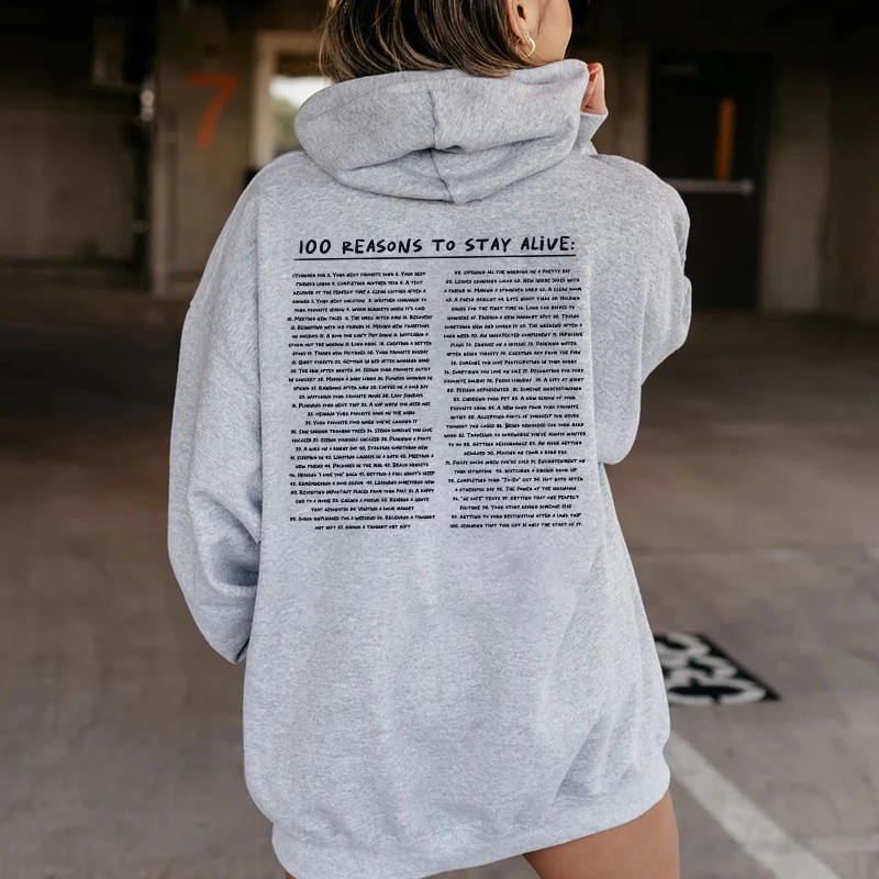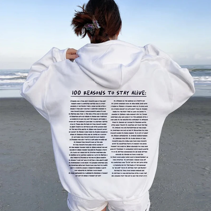 The hoodie features an uplifting message that reads, "100 Reasons To Stay Alive, keep going." This heartwarming message is prominently displayed on the front, with additional reasons printed on the back and sleeves. Each time you wear it, you carry a powerful reminder to stay positive and keep moving forward, no matter what challenges you face. The design is available in various colors, including lavender, dark grey, cream, pink, black, and white, allowing you to choose the one that best suits your style.