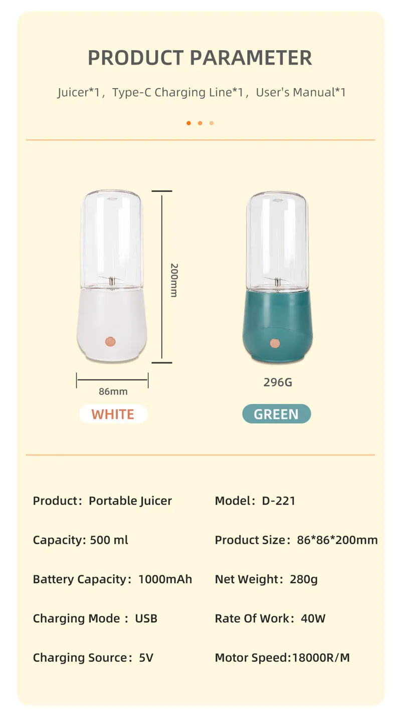 If you're looking for a portable, efficient, and easy-to-use blender that lets you enjoy fresh, healthy drinks on the go, the Kitchen Blender Cup Personal Blender Mini Fruit Juicer Mixer Portable Electric Juicer is the perfect choice. Here’s why: