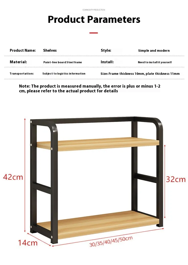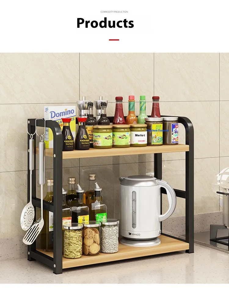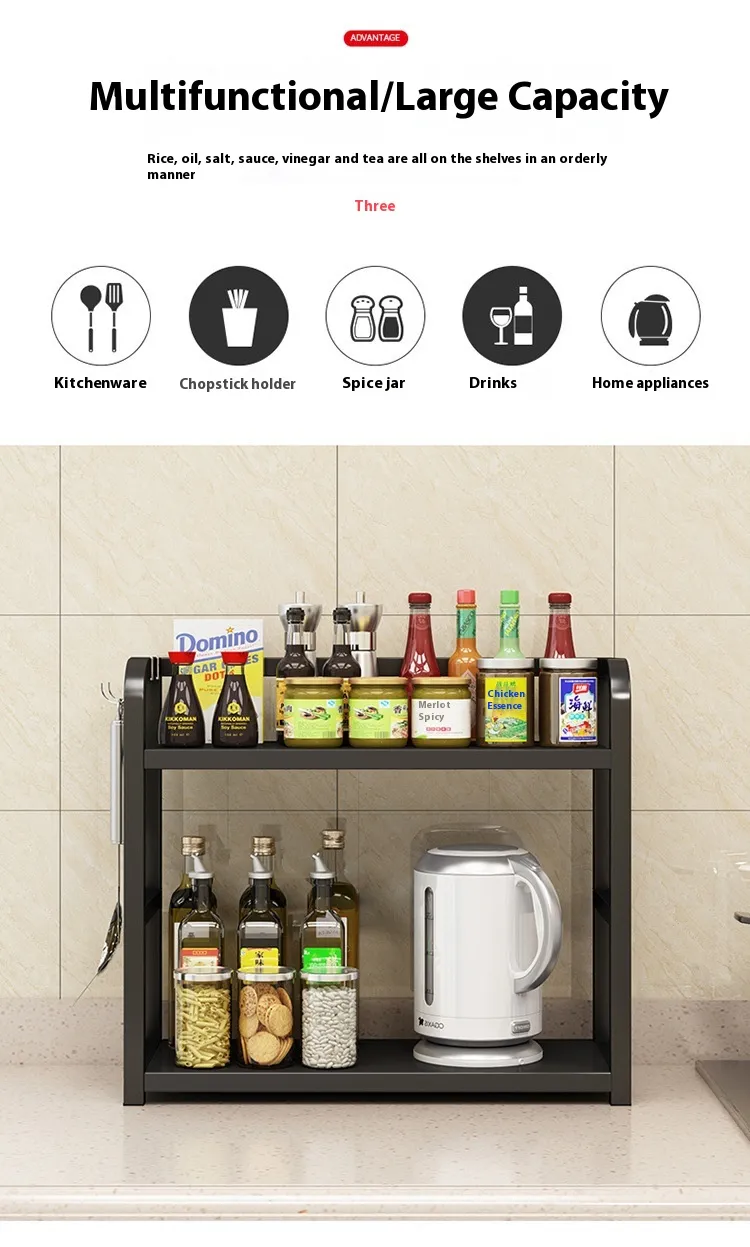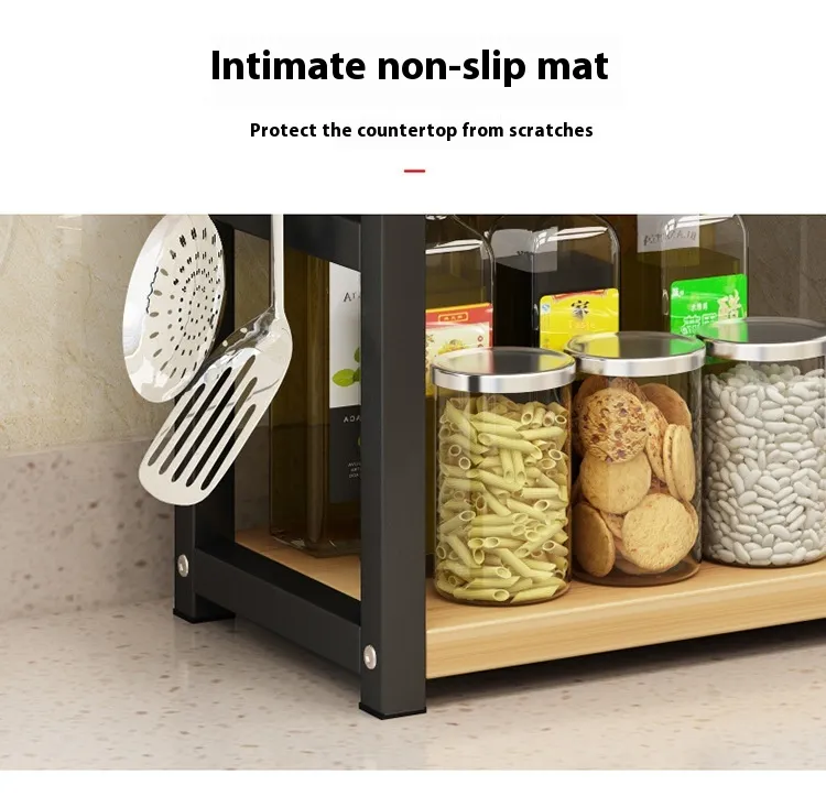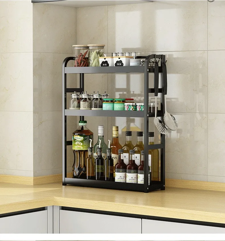 A kitchen counter shelf is a freestanding or mounted shelving unit placed on the countertop. It provides extra levels of storage, allowing you to neatly arrange spices, utensils, cookware, or decorative items without taking up additional floor or cabinet space.