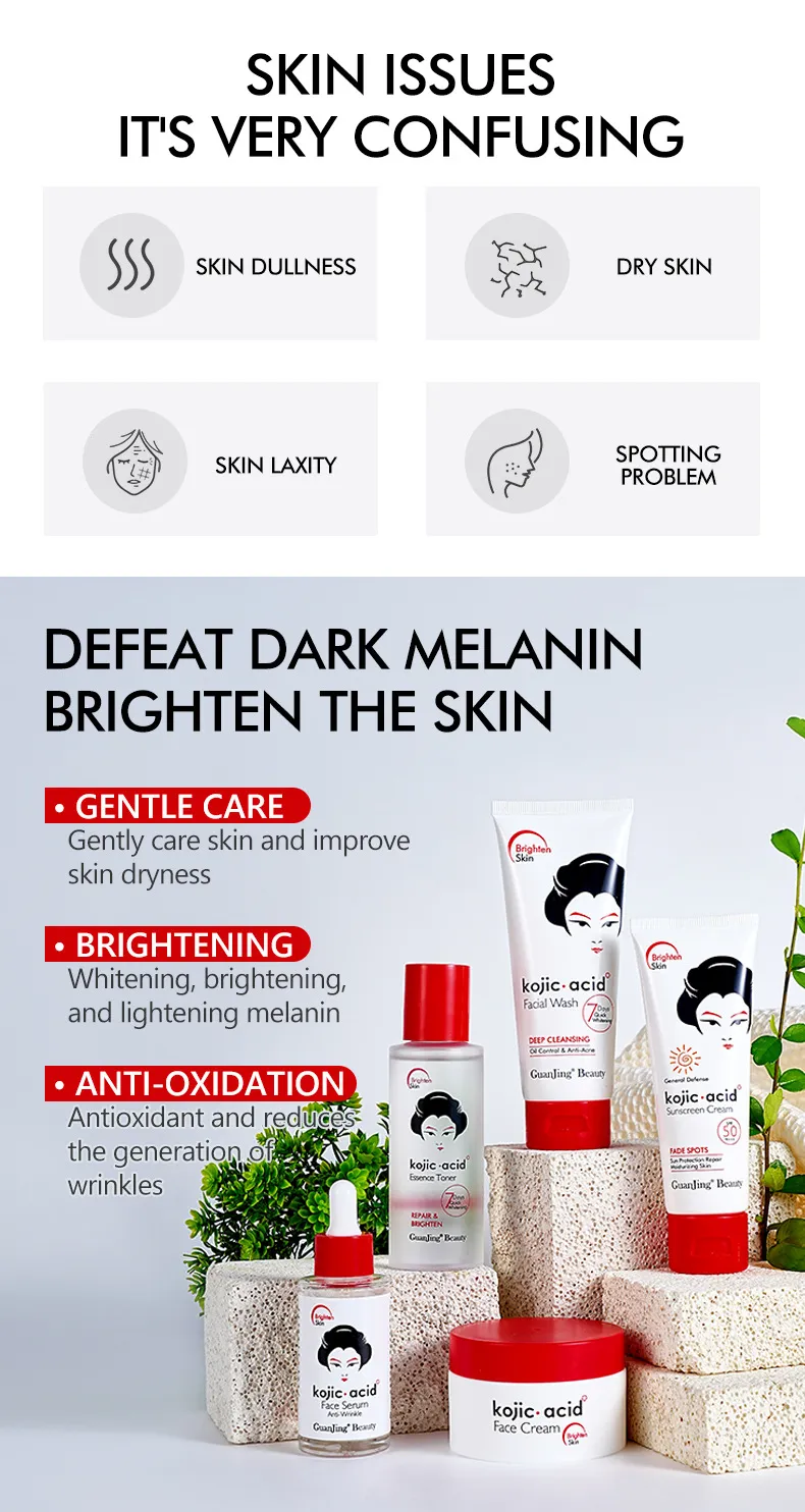 Kojic Acid is known for being a mild, natural brightening agent, making this set suitable for sensitive skin types that may not tolerate harsher treatments.
