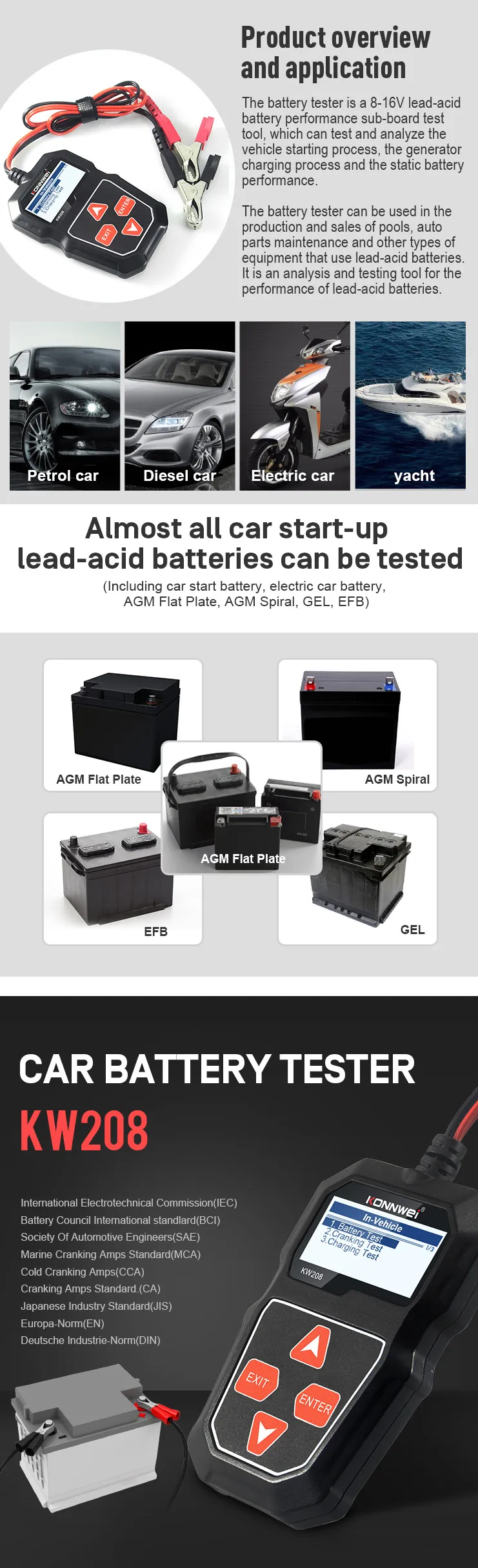 The KW208 battery tester is compatible with all 12V lead-acid battery types, making it suitable for various vehicles and applications.