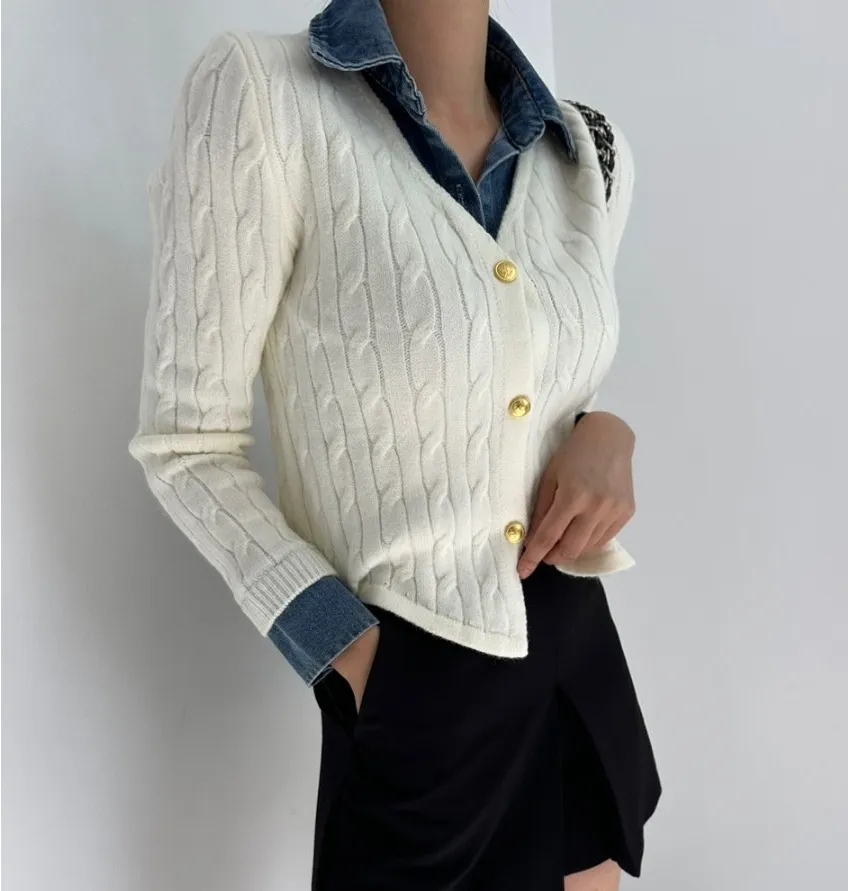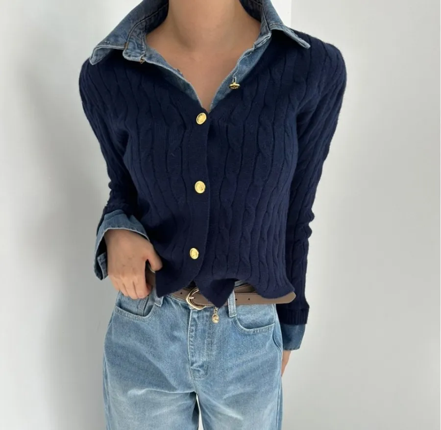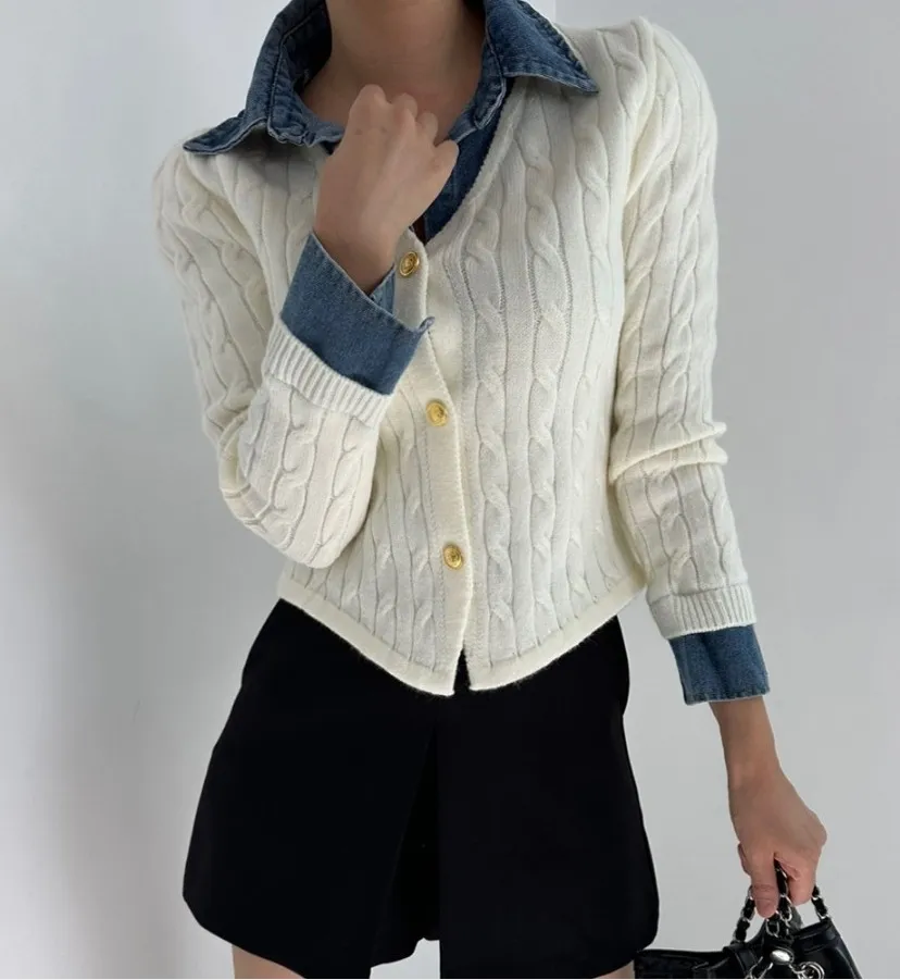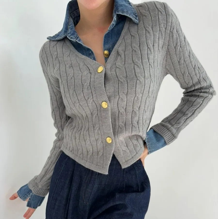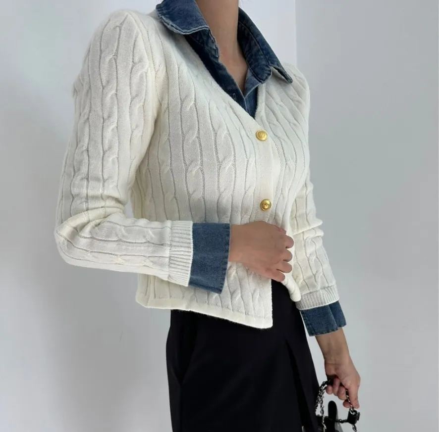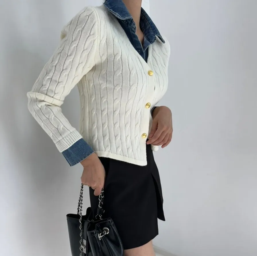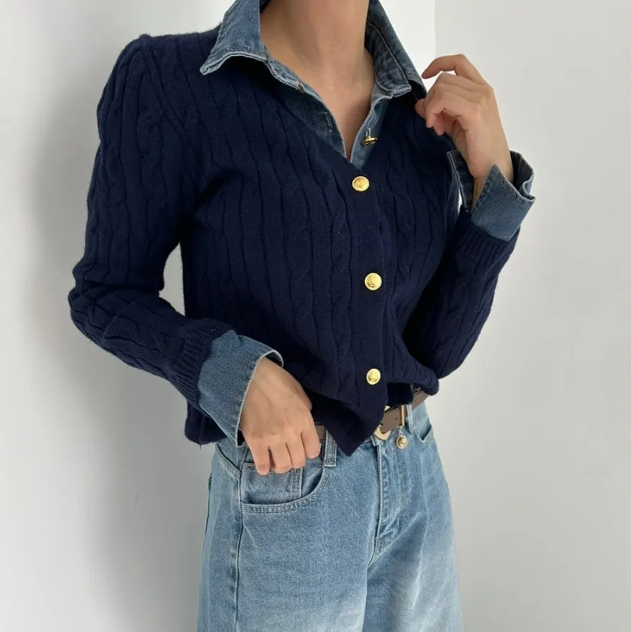 Korean Style Contrast Color Knitwear Denim Stitching Long Sleeve Sweater