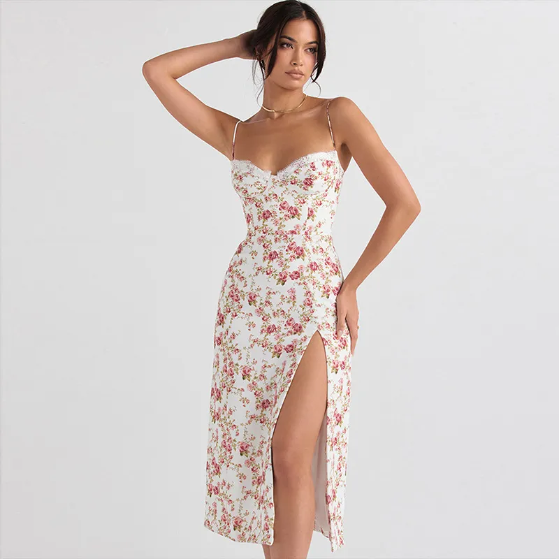 Lace Flowers Print Long Dress Sexy Fashion Slit Suspender Dress