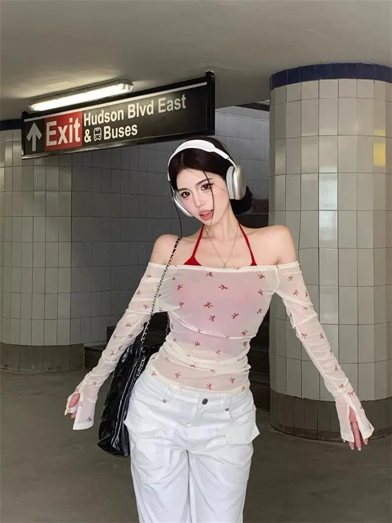 Chic and Stylish Ladies' Mesh Blouse Slim-fit Off-shoulder Top