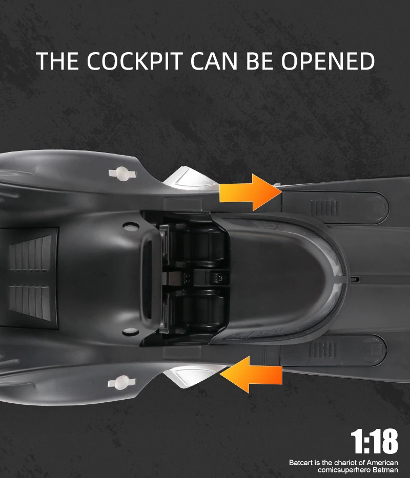 At a 1:18 scale, this Batmobile is impressively large, measuring over 30cm in length. The large scale allows for greater detail, from the aerodynamic design to the turbine engine at the rear. The larger size provides ample room for intricate touches and makes the model stand out as a showpiece in any collection, drawing attention and admiration from all angles.