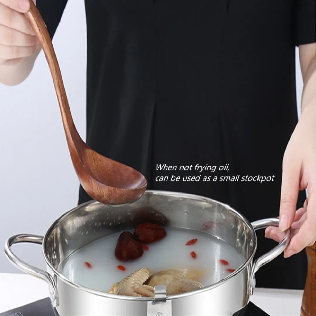 of food in hot oil. The ergonomic design ensures comfort and safety, even during extended frying sessions.