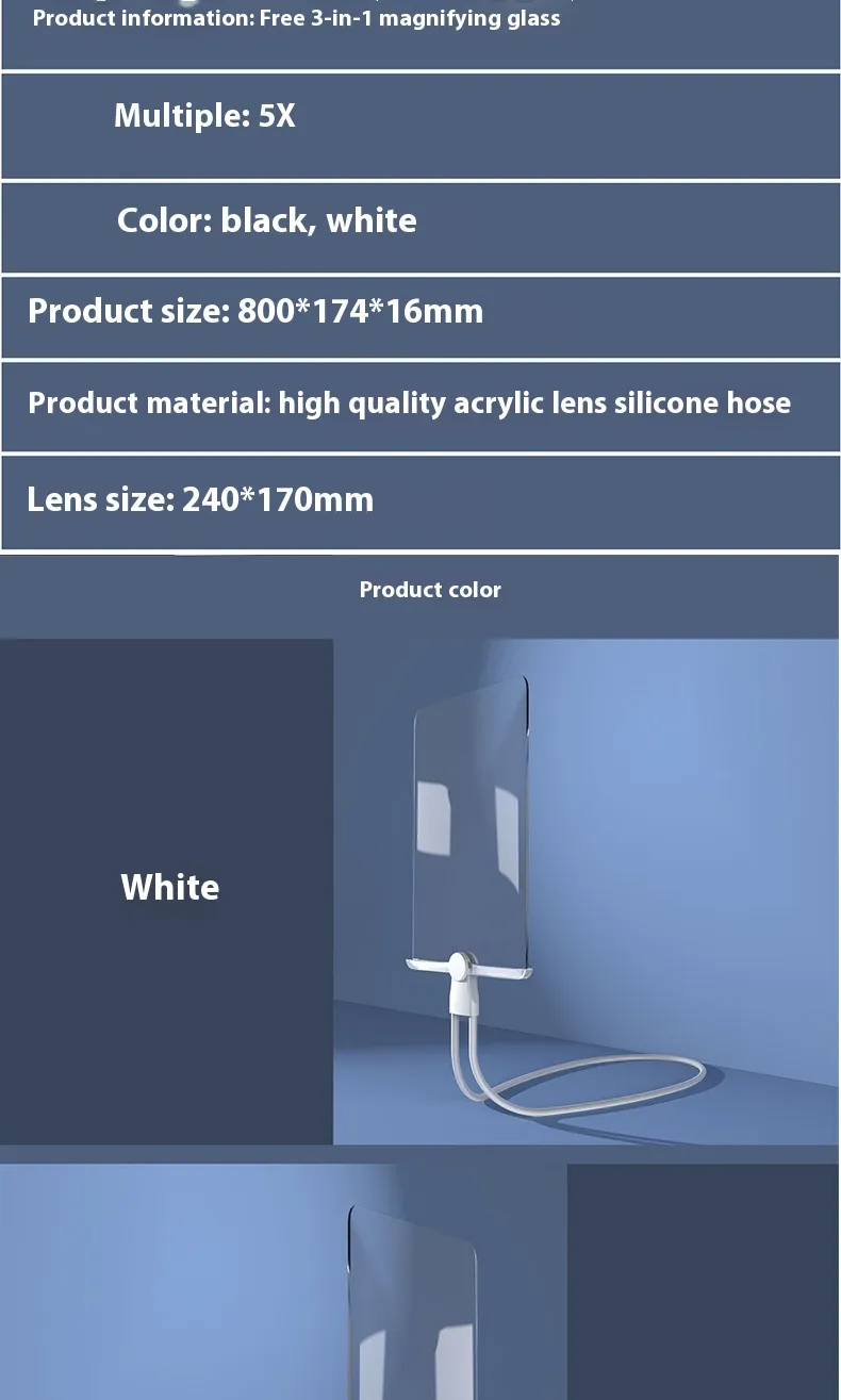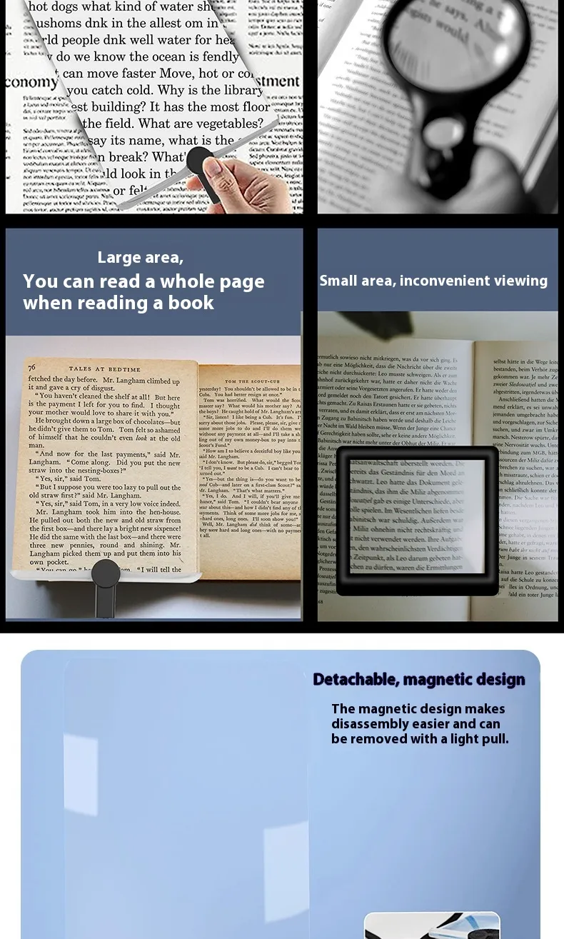 The Large Screen Ultra-thin Magnifying Glass HD Stand is the perfect tool for anyone who needs enhanced magnification with superior clarity. Whether you're reading fine print, working on detailed crafts, or examining small objects, this multi-function magnifying glass provides an HD view with its large screen and ultra-thin design. Its versatile functionality as both a handheld and desktop magnifier makes it ideal for use at home, in the office, or in hobby spaces. Designed for comfort, convenience, and durability, this magnifying glass helps reduce eye strain and provides clearer, more detailed views.