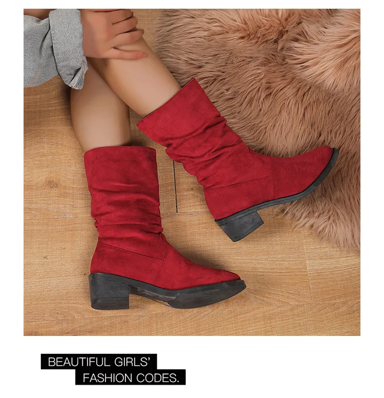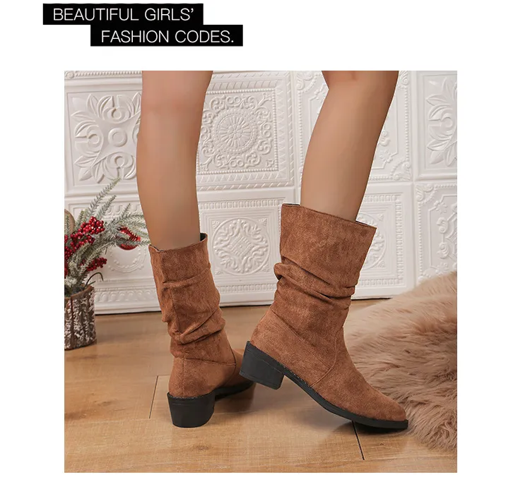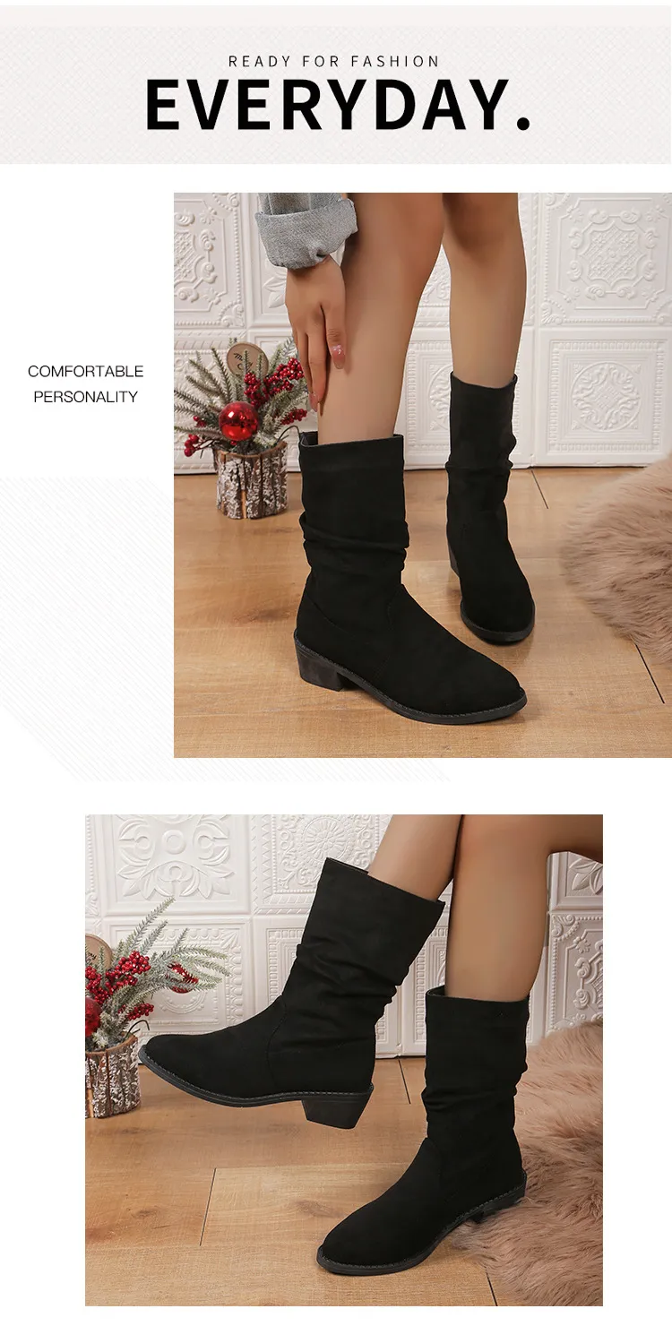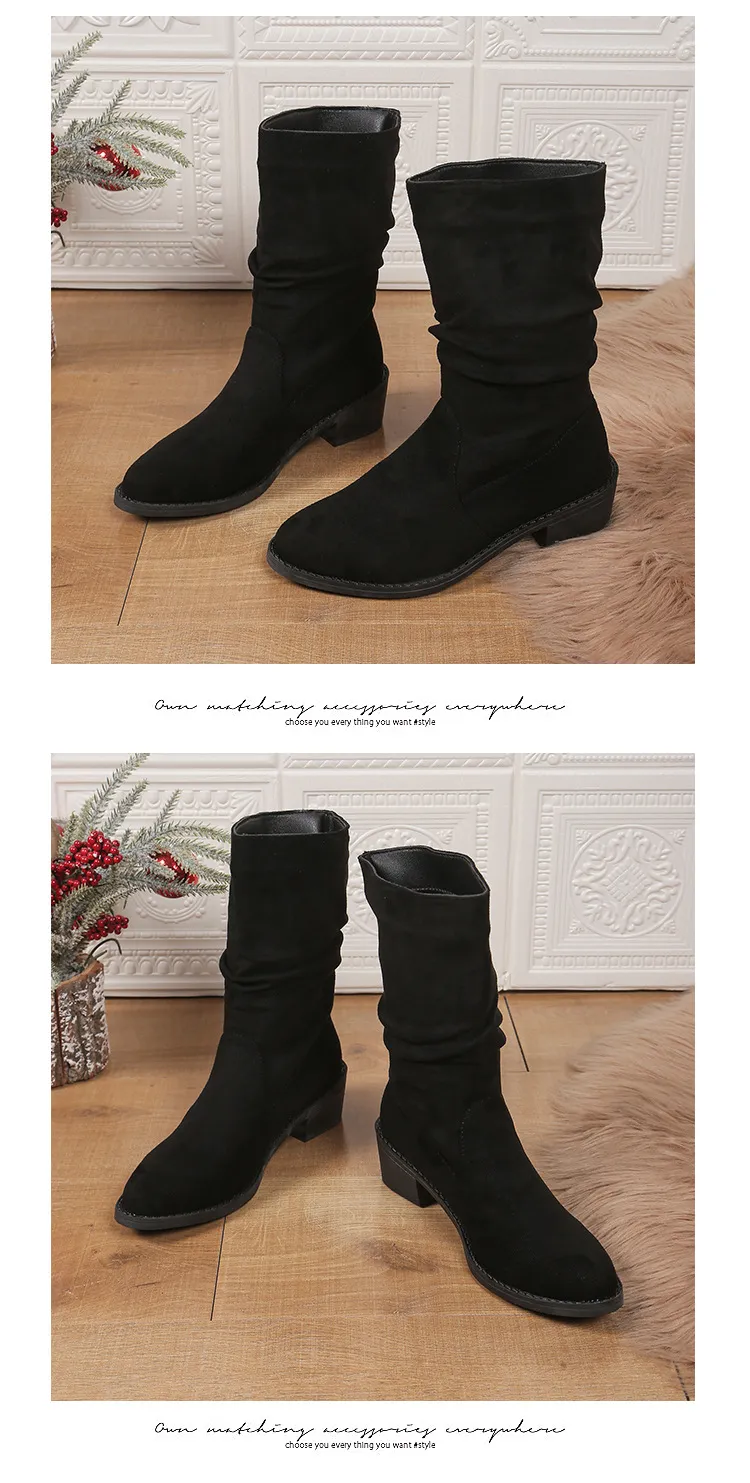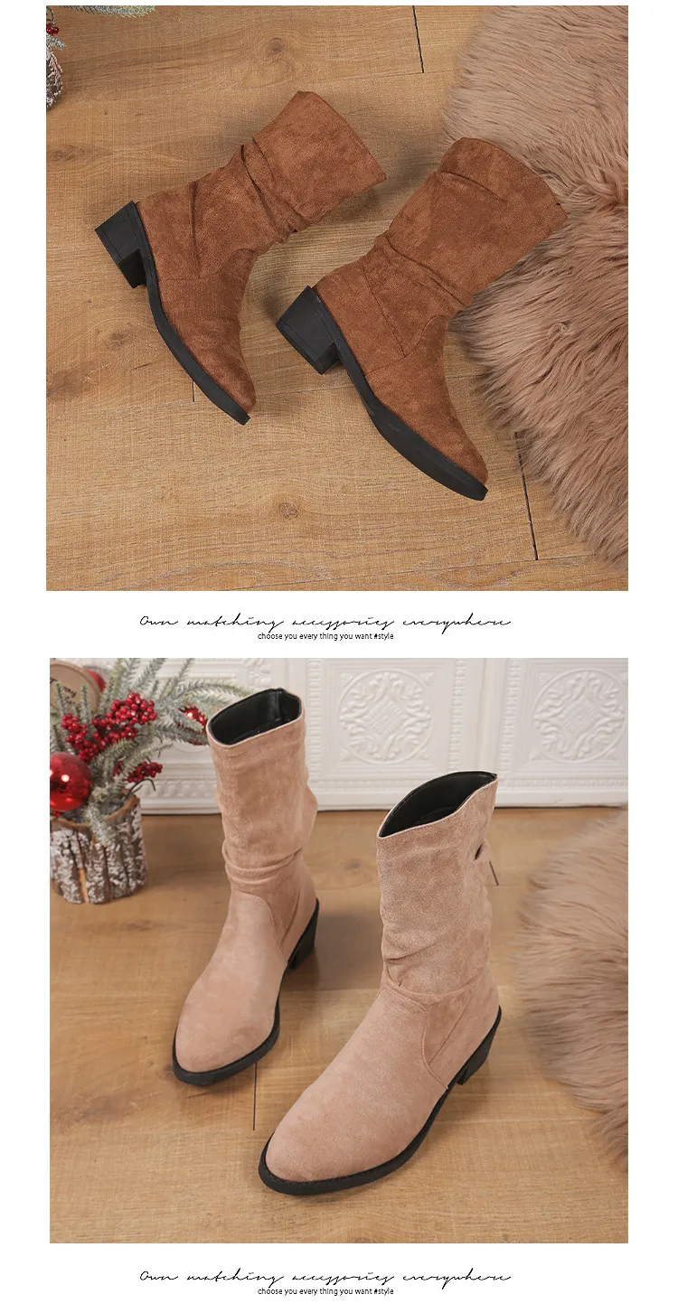 Our Large Size Thick Heel Pointed Toe Mid-Calf Smoke Pipe Boots for Women deliver the perfect blend of fashion, comfort, and versatility. Designed to suit all occasions, these boots are a must-have addition to your footwear collection.