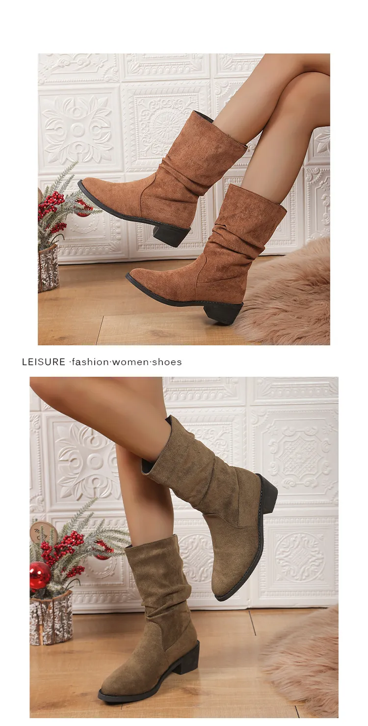 Large Size Thick Heel Pointed Toe Mid-calf Smoke Pipe Boots For Women