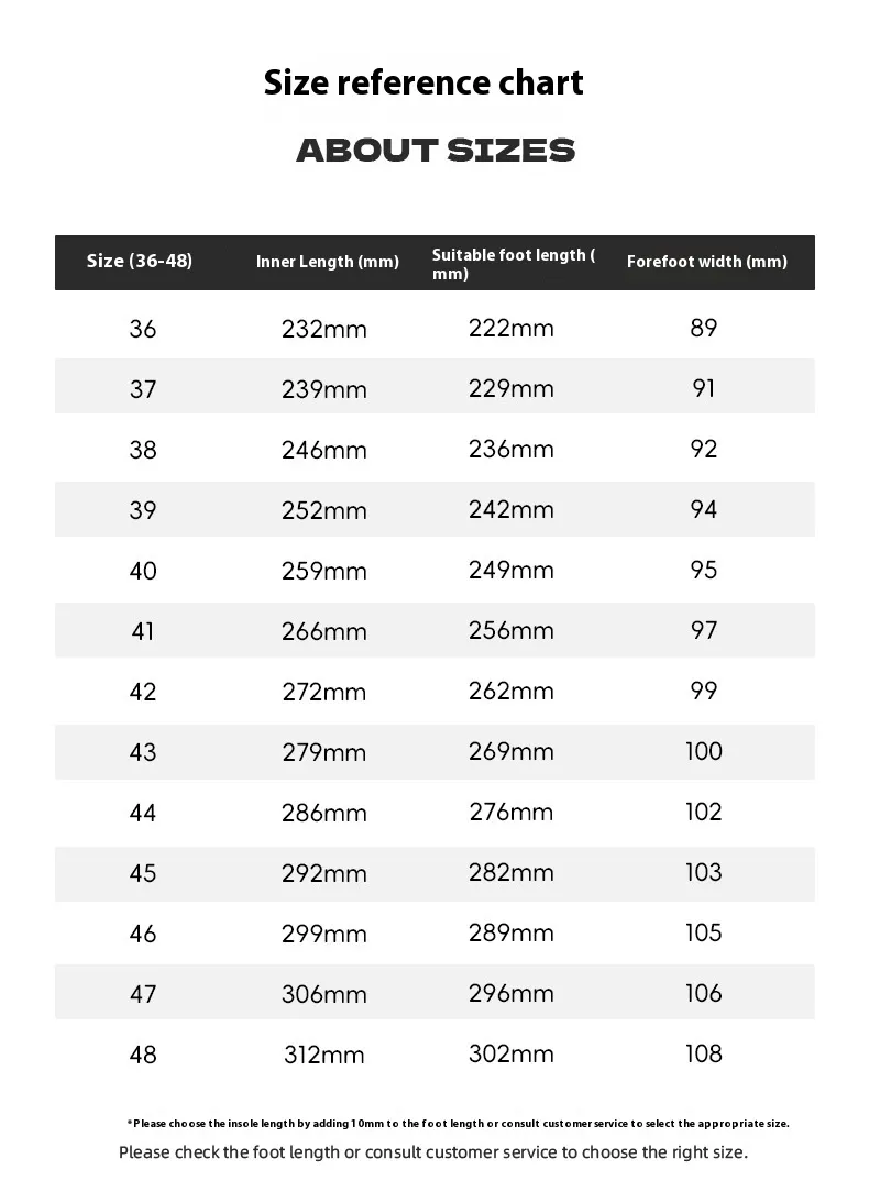 Size: 36, 37, 38, 39, 40, 41, 42, 43, 44, 45, 46, 47, 48