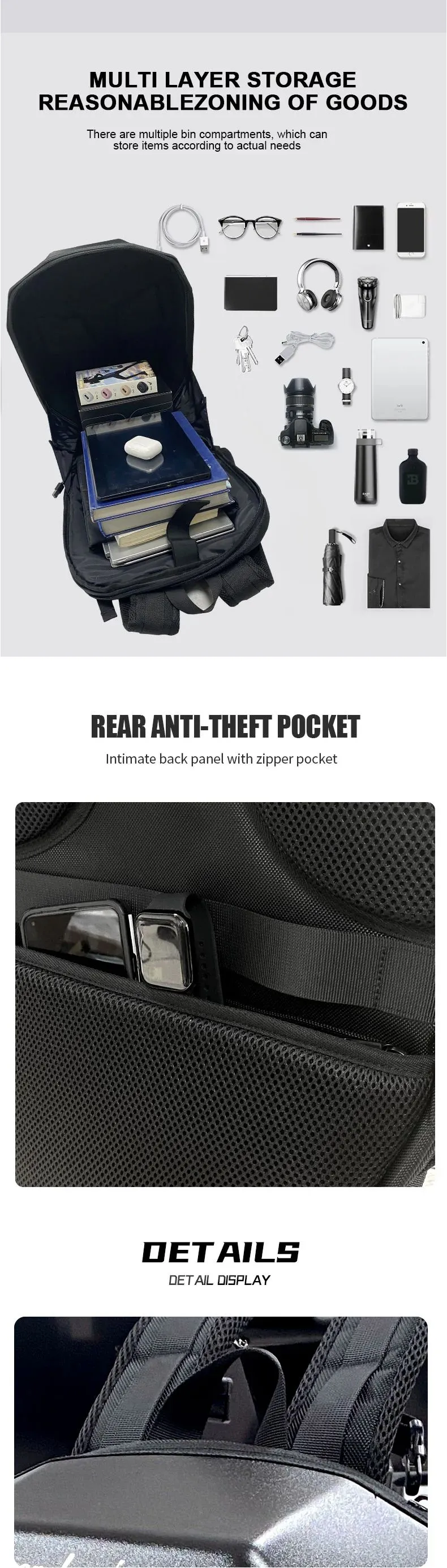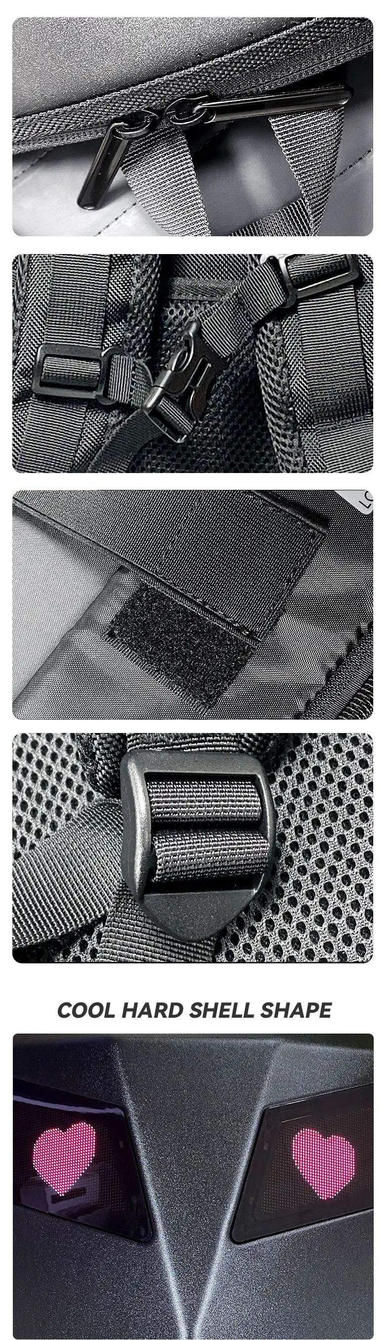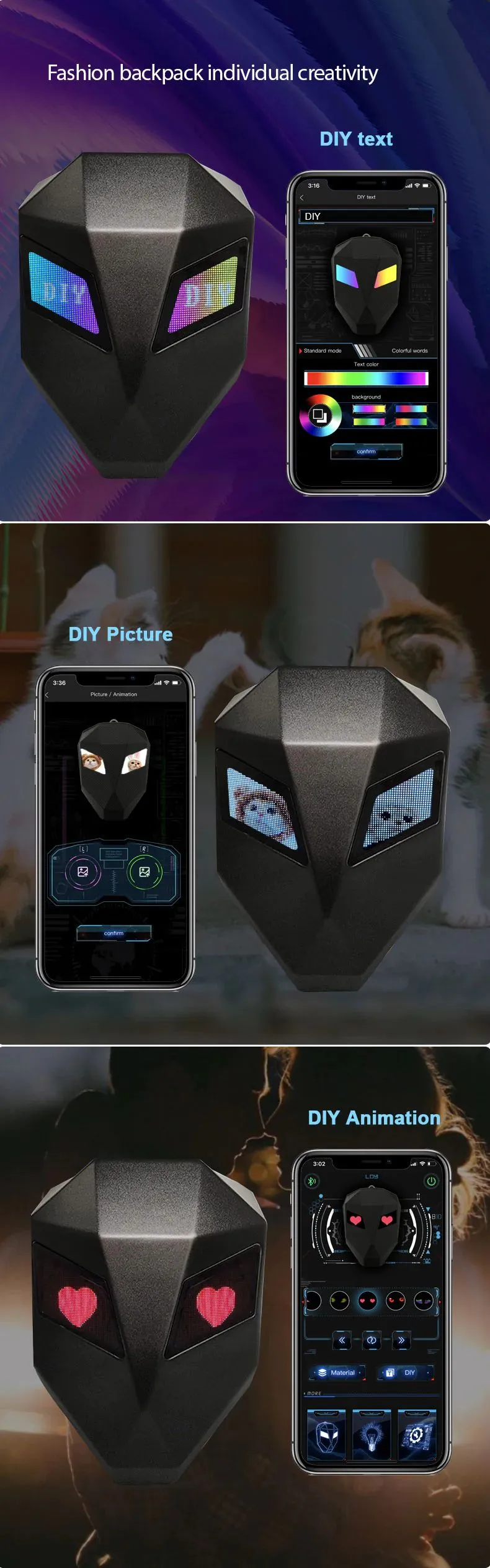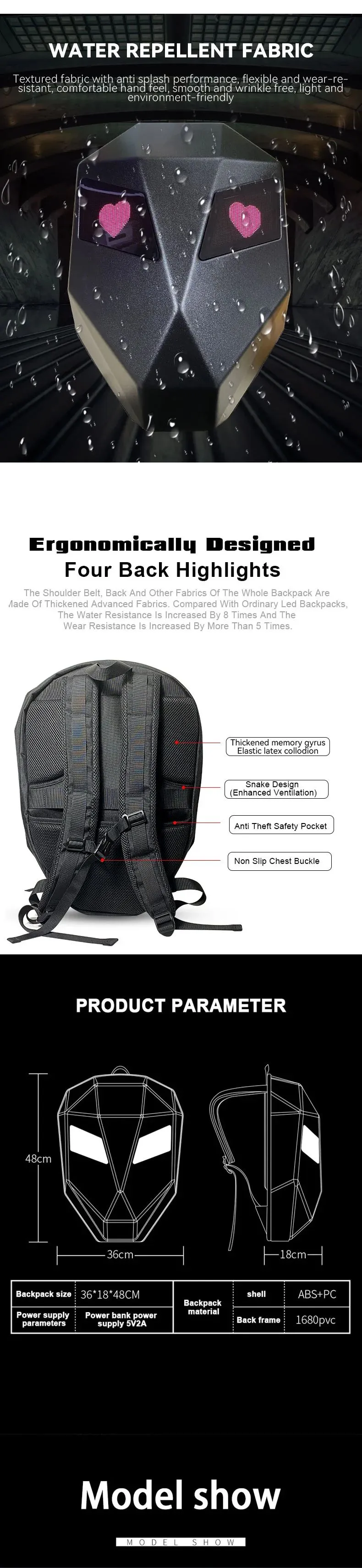 3D hardcore waterproof material, the back width uses 1680pvc, can use portable rechargeable power supplies, 48*48 full-color dot matrix screen, support text, pictures, GIF, and other formats, adjustable shoulder strap size, the back is made of breathable material, So you feel more comfortable when traveling, hiking, etc.