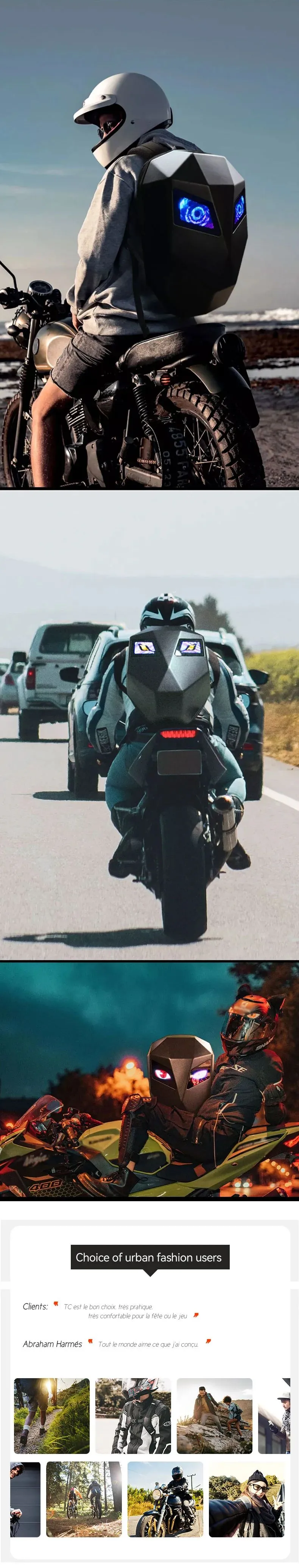 The LED Backpack Screen Rider Motorcycle is a forward-thinking riding accessory that enhances visibility, expression, and convenience. With its integrated LED screen and practical backpack design, it supports safer, more confident riding without sacrificing comfort or utility.