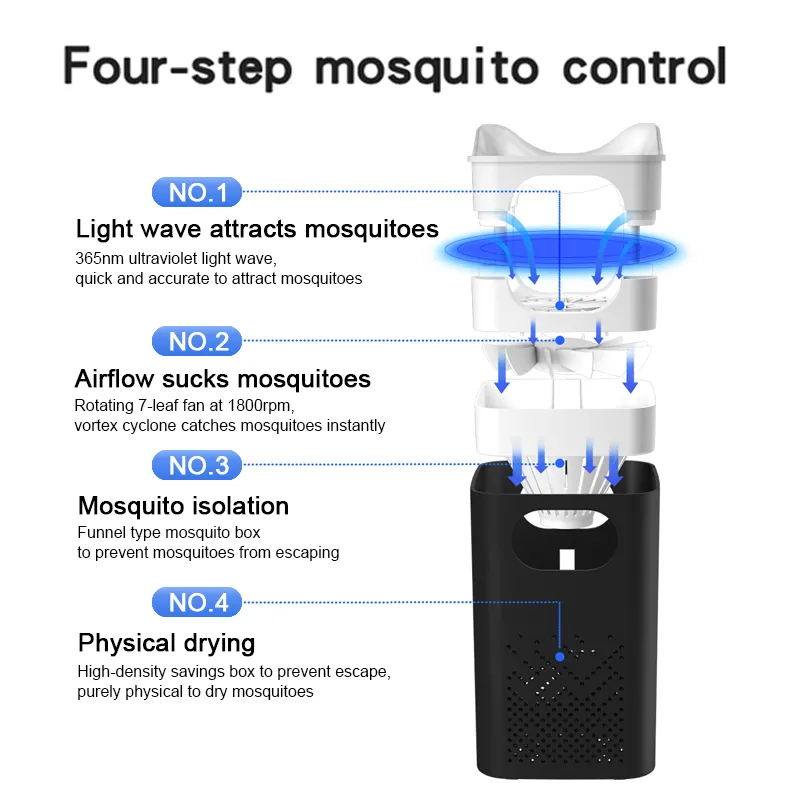 - Safe and Hygienic: Mosquitoes are trapped in a collection area, which is easy to clean and maintain.