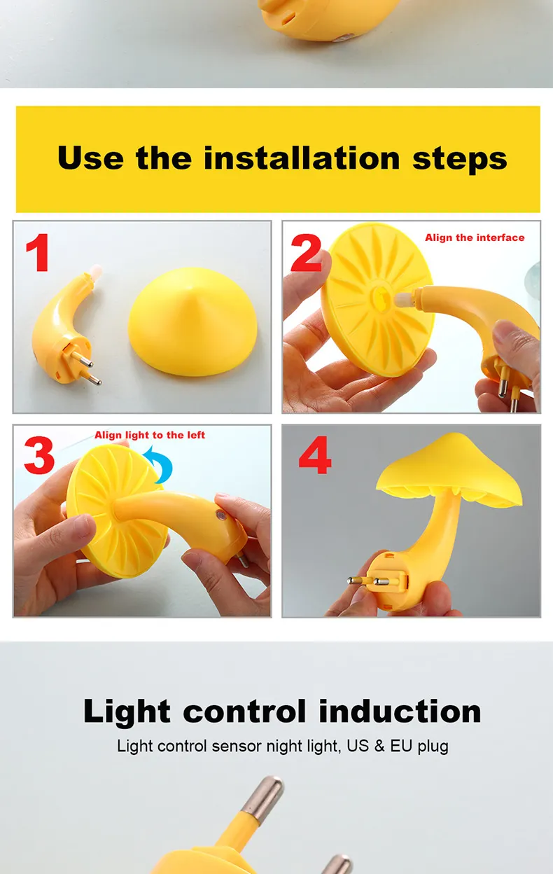 LED Night Light Mushroom Wall Socket Lamp EU US Plug Warm White Light-control Sensor Bedroom Light Home Decoration