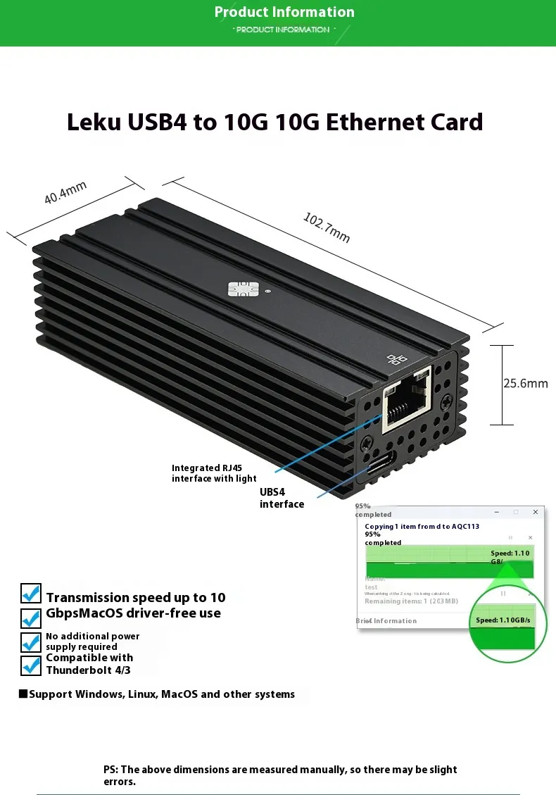 For professionals working with large datasets or high-resolution video files, the Leyu USB4 NIC 10G offers unmatched reliability and speed. Its high-speed capabilities make it perfect for industries where performance is crucial, such as video production, engineering simulations, and cloud computing. Additionally, its Lightning 10 Gigabit Electrical Port ensures a more consistent and stable connection, even when dealing with high-demand applications. For gamers, the Leyu USB4 NIC 10G significantly improves online gameplay with minimal latency, ensuring faster ping times and smoother gaming experiences. Whether you're streaming, playing high-performance games, or using bandwidth-intensive applications, this NIC ensures that you won’t experience any lag.