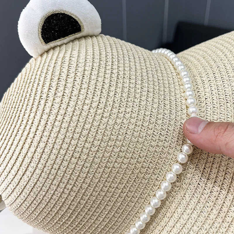 This adorable straw hat features charming little bear ears on the sides, combining practicality with a touch of fun. Whether your child is