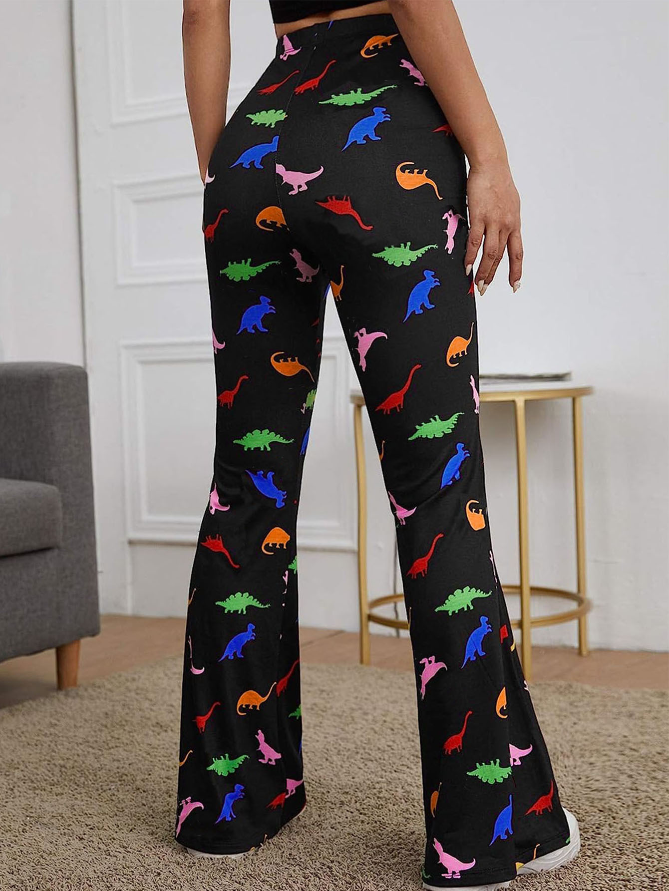 Long Bell-bottom Pants Dinosaur Printed High Waist High Elastic Trousers For Women
