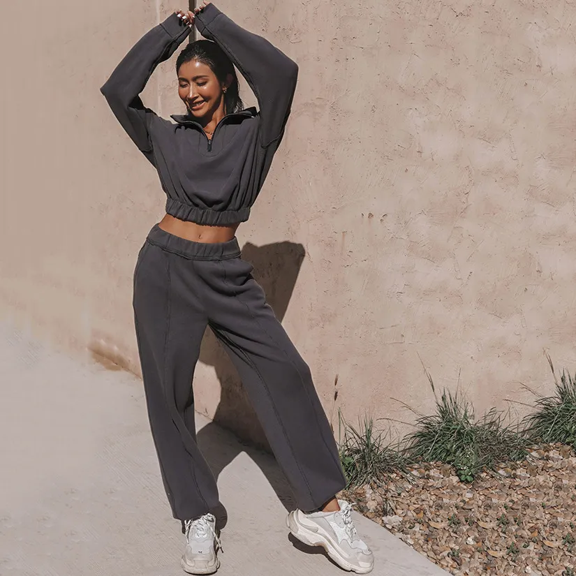 Elevate your wardrobe with our Long Sleeve Turtleneck Sweatshirt Stand Up Zipper Short Top paired with Loose Straight Leg Pants—a perfect combination of modern style and ultimate comfort.