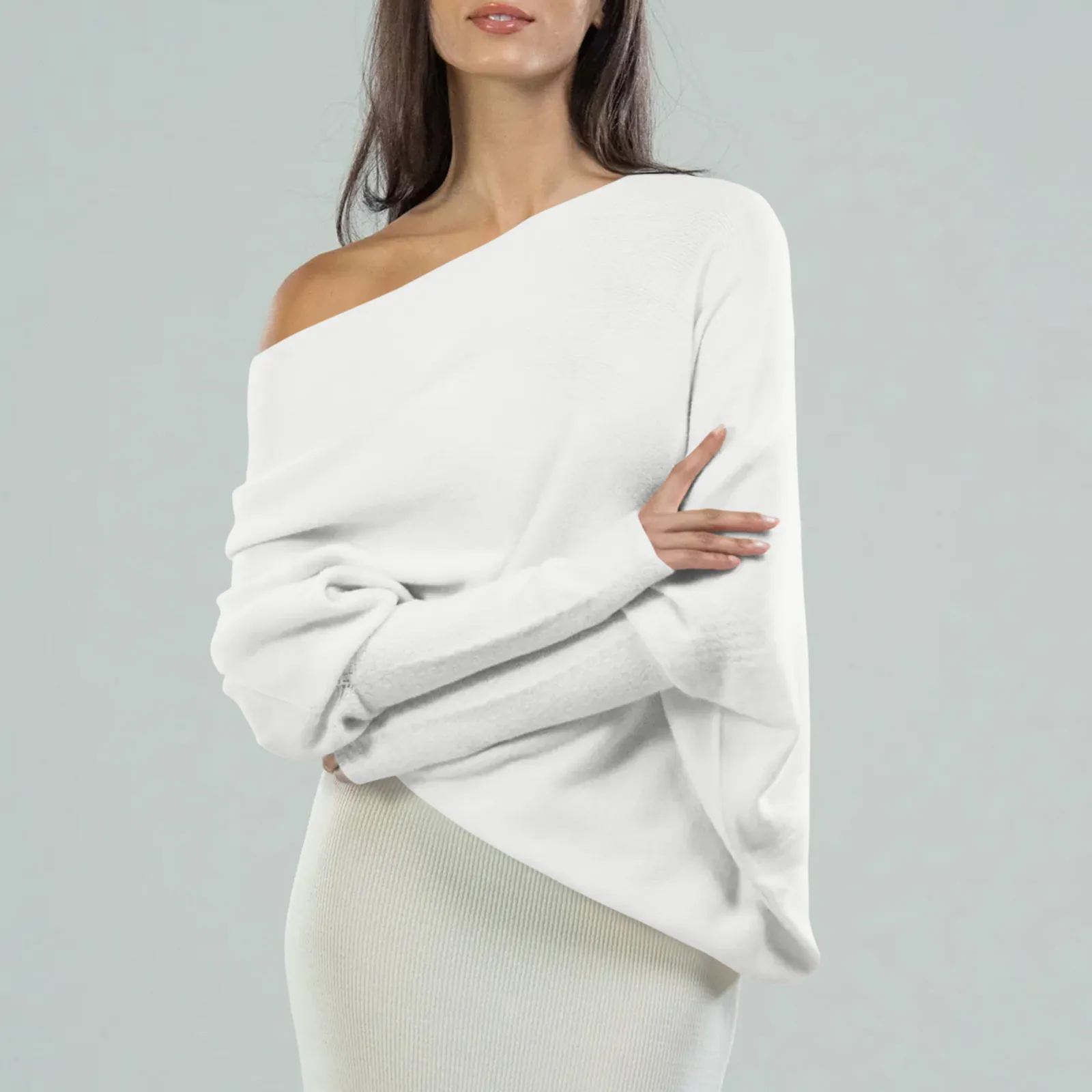 Loose Bat Sleeve Sweater Tops Simple Casual Fashion Versatile Solid Color Round Neck Sweater For Women
