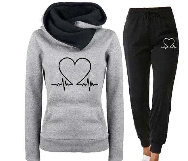 Love Heart Printed Sports Suit Hooded Sweatshirt Top And Drawstring Pants Fashion Casual Clothing For Women