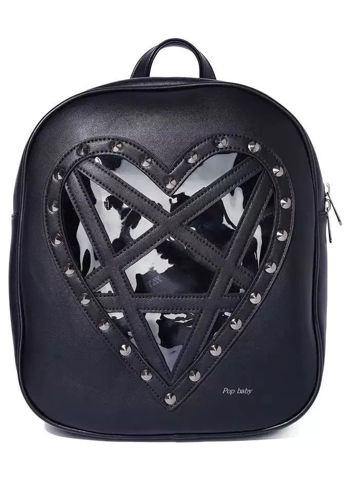 outfit. Featuring striking rivet details and playful heart-shaped accents, this backpack combines punk-inspired aesthetics with functional
