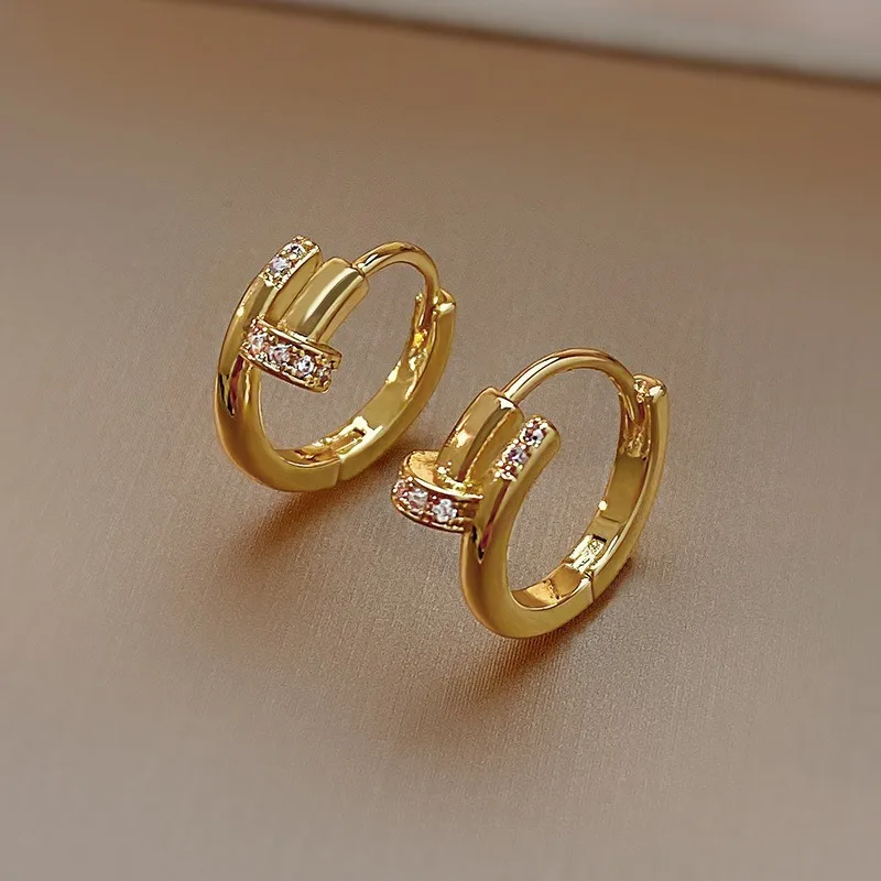 These earrings feature a nail-inspired design that adds a modern, edgy twist to the traditional hoop style. The nail aesthetic, combined with the sparkling cubic zirconia stones, creates a bold statement piece that’s perfect for women who love fashion-forward jewelry.
