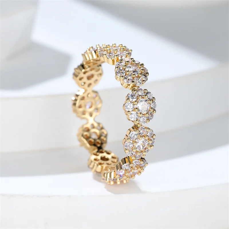 Crafted with meticulous attention to detail, the yellow gold finish adds warmth and richness, complementing the radiant crystal stones. This ring is a versatile piece that can be worn daily or reserved for special occasions such as weddings, anniversaries, or formal events.