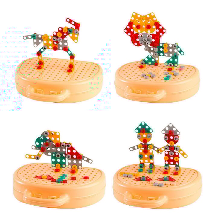 The toolbox includes a variety of interchangeable pieces and modular parts that promote open-ended play. Children can practice fitting bolts, twisting screws, placing pegs, and matching shapes, helping build confidence and dexterity. These activities are aligned with early learning concepts such as spatial awareness, problem solving, and sensory exploration.