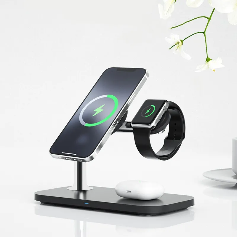 The Magnetic 3-in-1 Wireless Charger is designed to charge up to three devices simultaneously. It offers dedicated charging spots for your smartphone, smartwatch, and wireless earbuds, ensuring that all your essential gadgets are powered up in one place. Whether you have an iPhone, Samsung Galaxy, Apple Watch, or wireless earbuds, this charger can handle it all with ease.