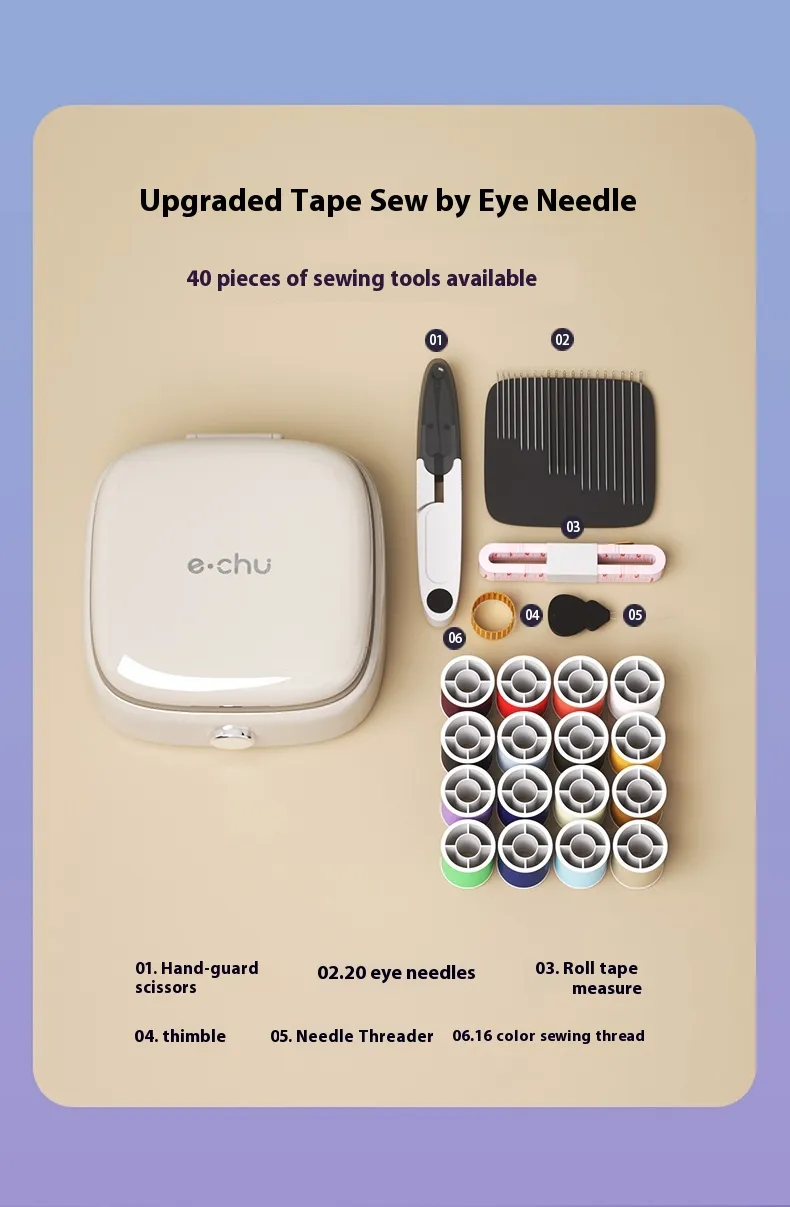 01. Hand scissors 02.20 large eye needles 03. Tape measure 04. Top pin 05. Needle piercer 06.16 color sewing thread