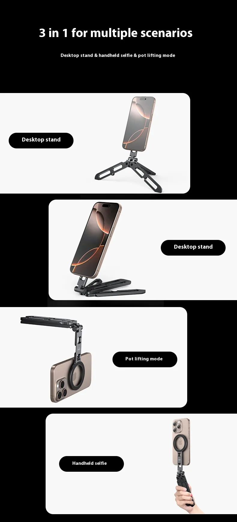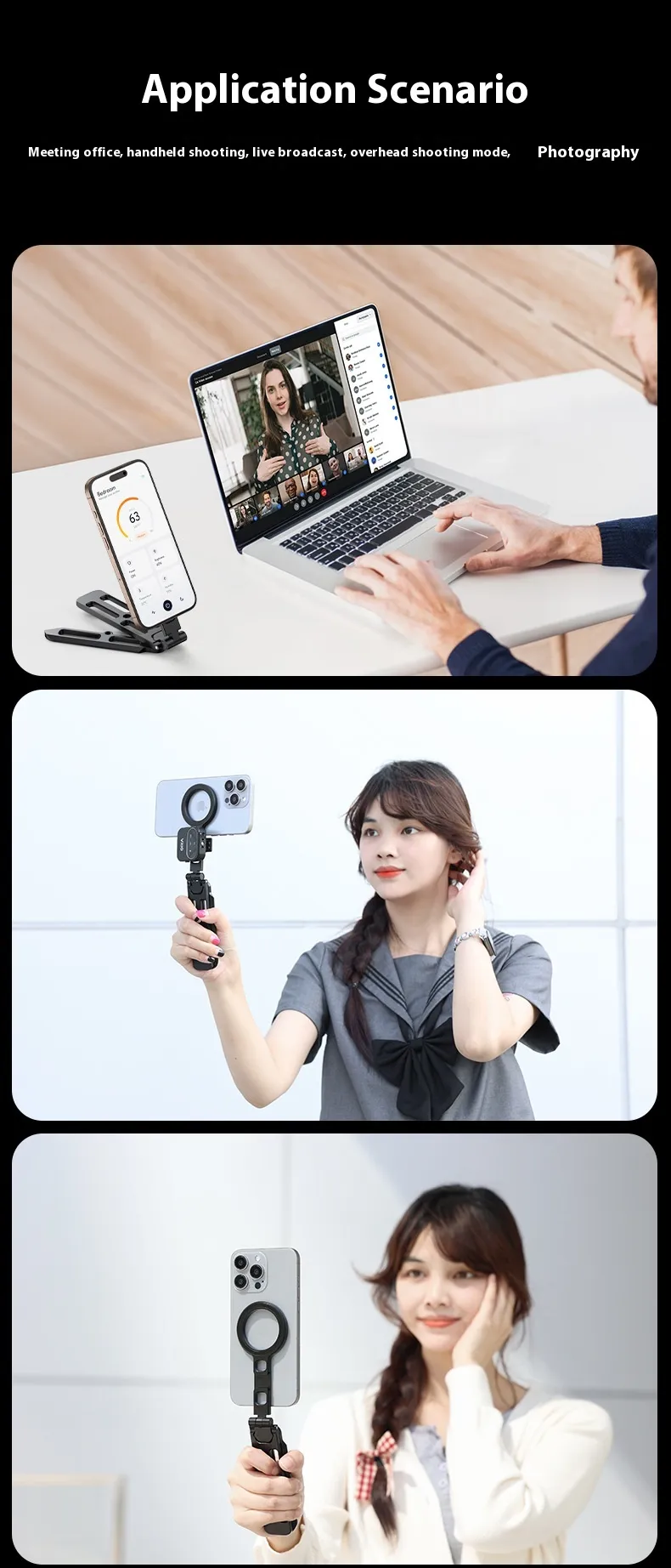- Great for Vlogging and Photography: Whether you're filming a vlog, capturing nature shots, or taking group photos, the tripod’s magnetic base and flexibility allow you to create the perfect shot without worrying about unstable surfaces.