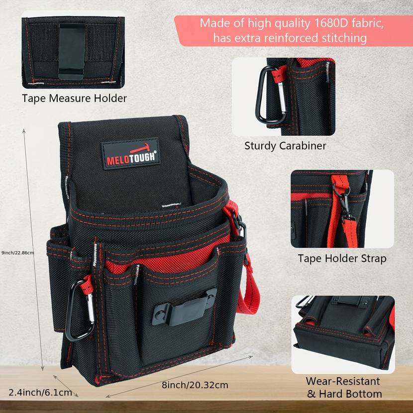 The MELOTOUGH Electrician's Compact Tool Pouch stands out from other tool pouches due to its exceptional durability, functional design, and compactness. Unlike other bulky organizers, this pouch is designed to keep your tools organized while remaining lightweight and easy to carry. The heavy-duty 1680D fabric ensures that it can withstand even the harshest working conditions, while the multiple pockets, carabiner clip, and tape holder provide added convenience and accessibility. Whether you're a professional electrician, handyman, or DIY enthusiast, this pouch will make your work more efficient and organized.