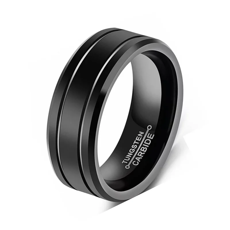 The black stainless steel finish on this 8mm tungsten carbide ring gives it a sleek, modern look that’s perfect for those