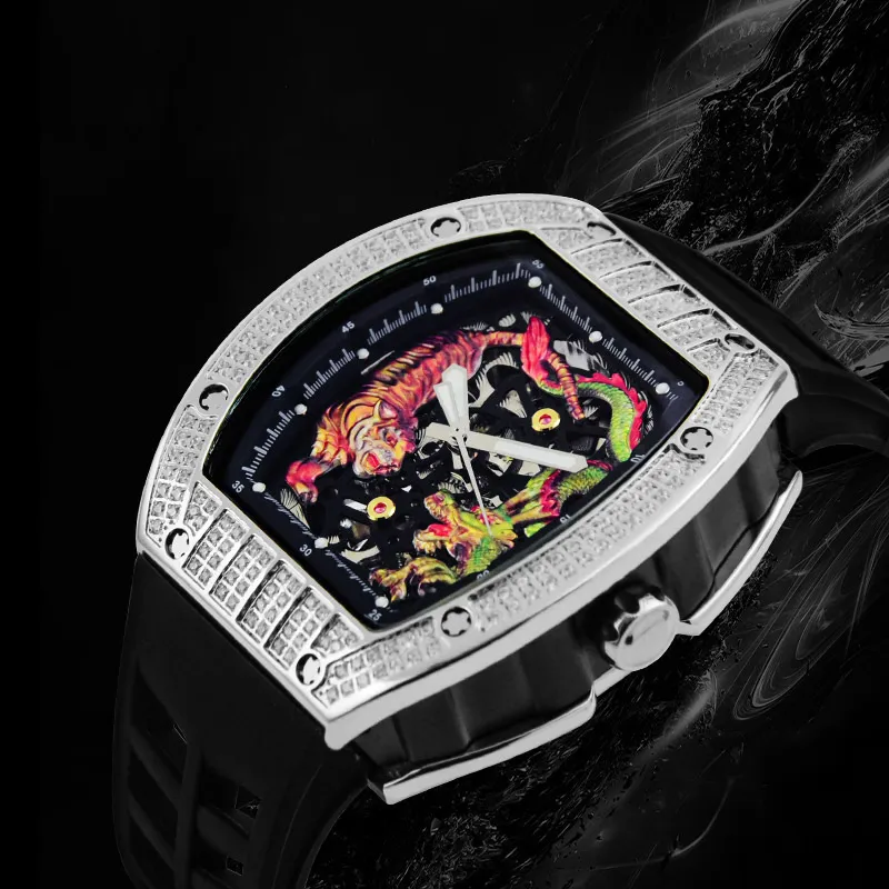 Redefine your style with the Men’s Fashion Casual Automatic Mechanical Dragon Tiger Diamond-Embedded Watch. Shop now and own a timepiece that blends artistic design, luxury, and precision engineering.