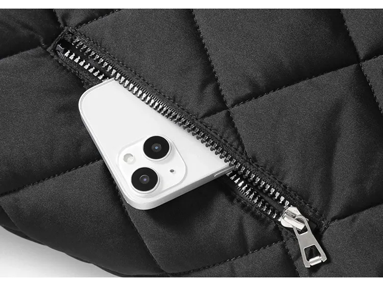 This coat features a rhombic-sewing (diamond-shaped) pattern that adds a unique, stylish texture. The quilted design not only looks great