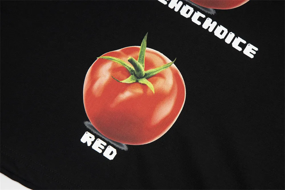 With its realistic 3D tomato print, this T-shirt offers a unique way to express your love for fruits, vibrant designs, and fun fashion. Its playful look is ideal for those who want to stand out and make a bold statement with their clothing.