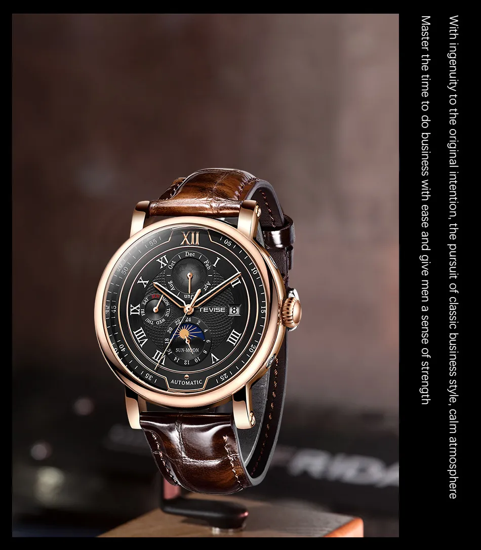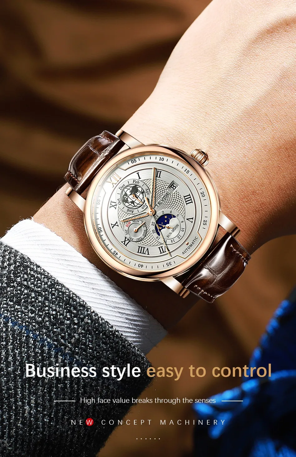 Experience the beauty of celestial mechanics with the Men's Waterproof Moon Phase Automatic Mechanical Watch, a luxurious timepiece