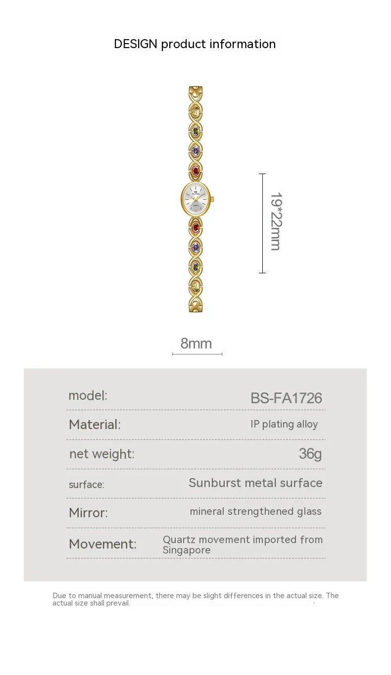 The Mid-Ancient Fashion Oval Colored Gems Rainbow Light Luxury Watch is an exquisite timepiece that blends ancient-inspired aesthetics with modern luxury. Featuring a beautifully crafted oval dial, this watch is adorned with an array of colored gems that reflect a rainbow of light, creating a captivating and luxurious look. The mid-ancient design pays homage to timeless elegance, with intricate detailing and vibrant colors that evoke a sense of royalty and sophistication. This stunning watch is perfect for women who appreciate high fashion, art, and a unique blend of historical inspiration and contemporary luxury.