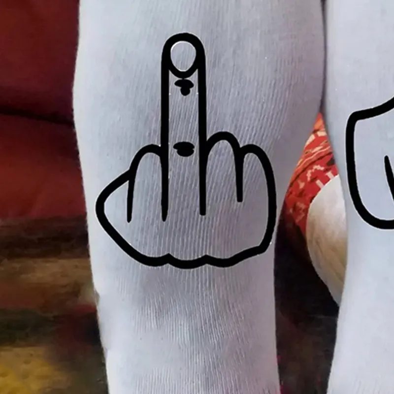 - Design: Features a bold middle finger graphic, adding a playful and rebellious touch to your socks