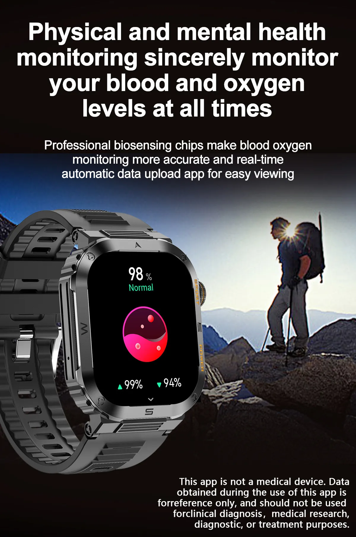 Military smartwatches are built to last, with strong, shock-resistant materials that can withstand drops, impacts, and rough conditions. Whether you're trekking through the wilderness or engaging in intense workouts, this smartwatch is designed to endure harsh environments, making it perfect for both adventure and daily wear.