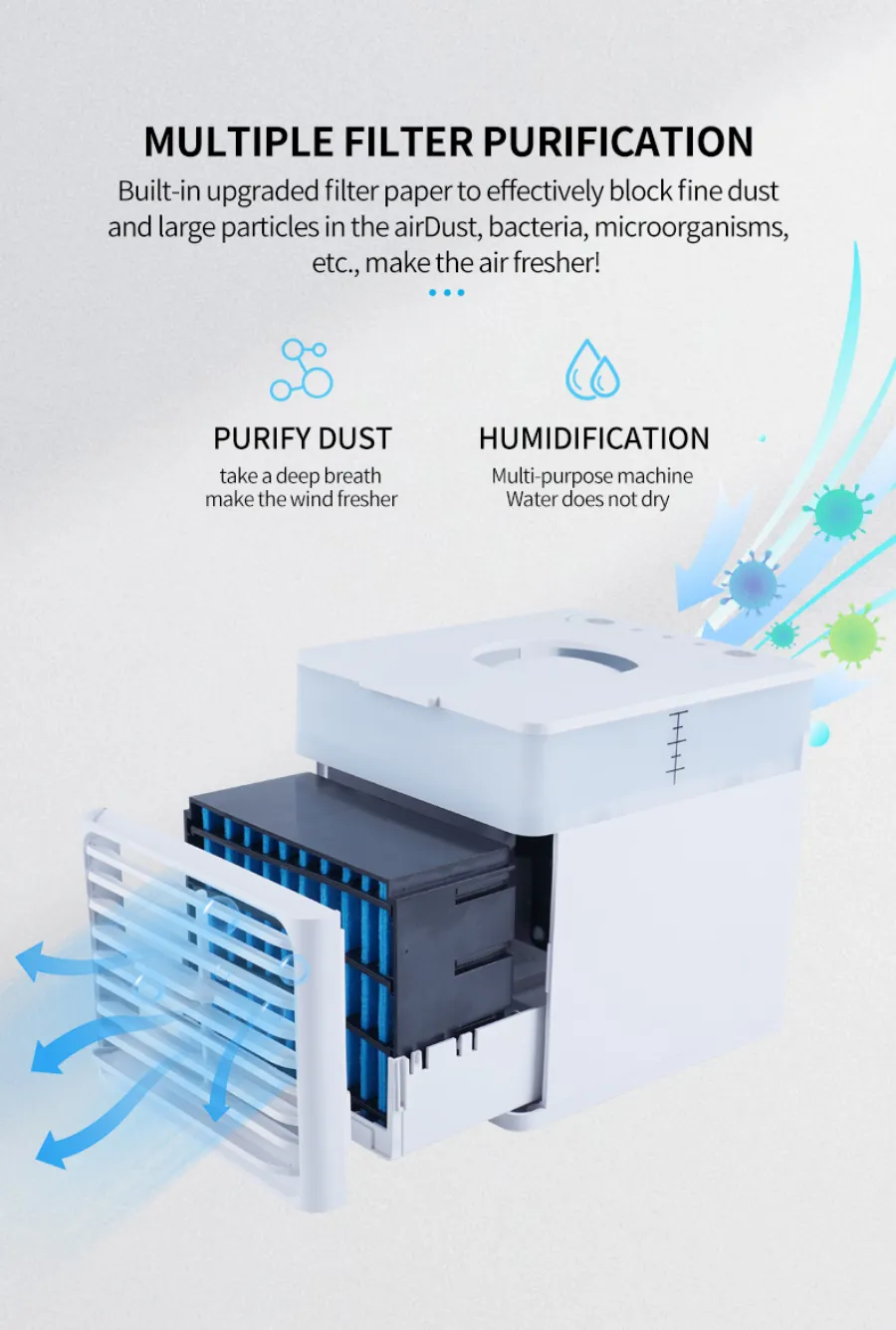 This device functions as a fan, air cooler, and humidifier, offering versatile cooling and air purification to meet your needs in various