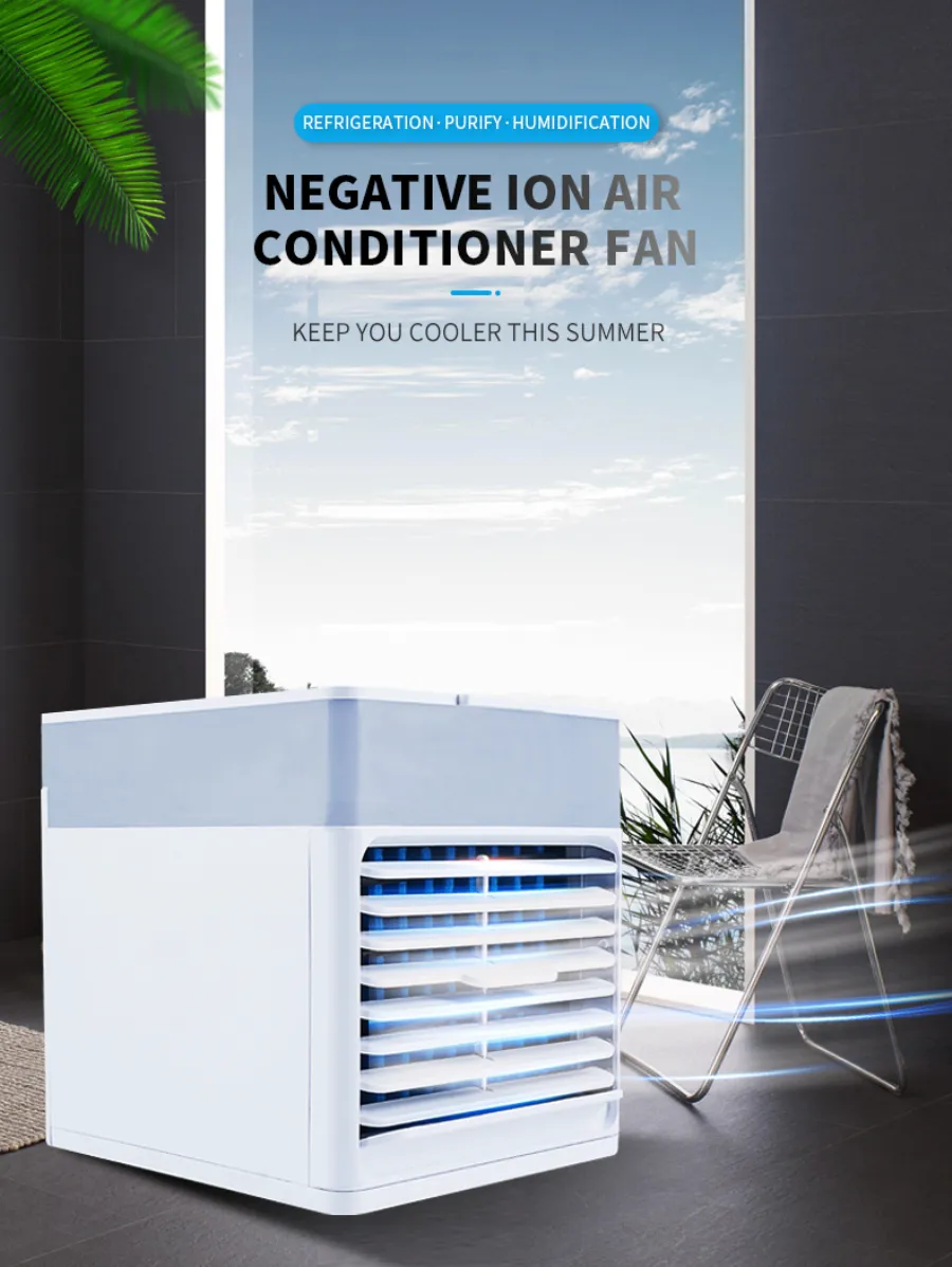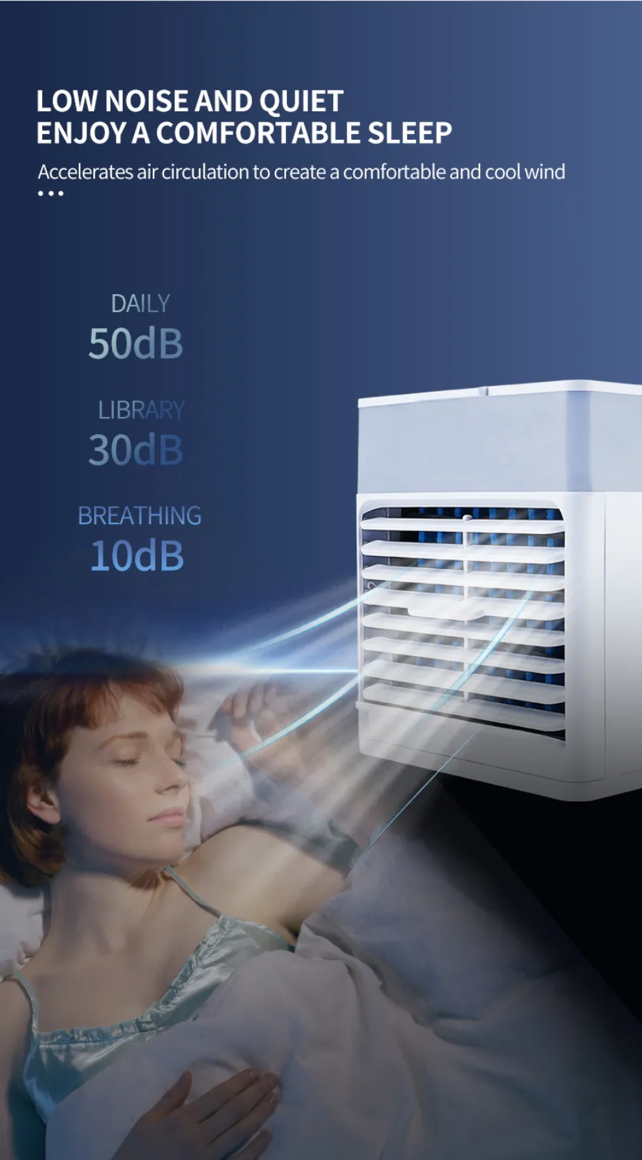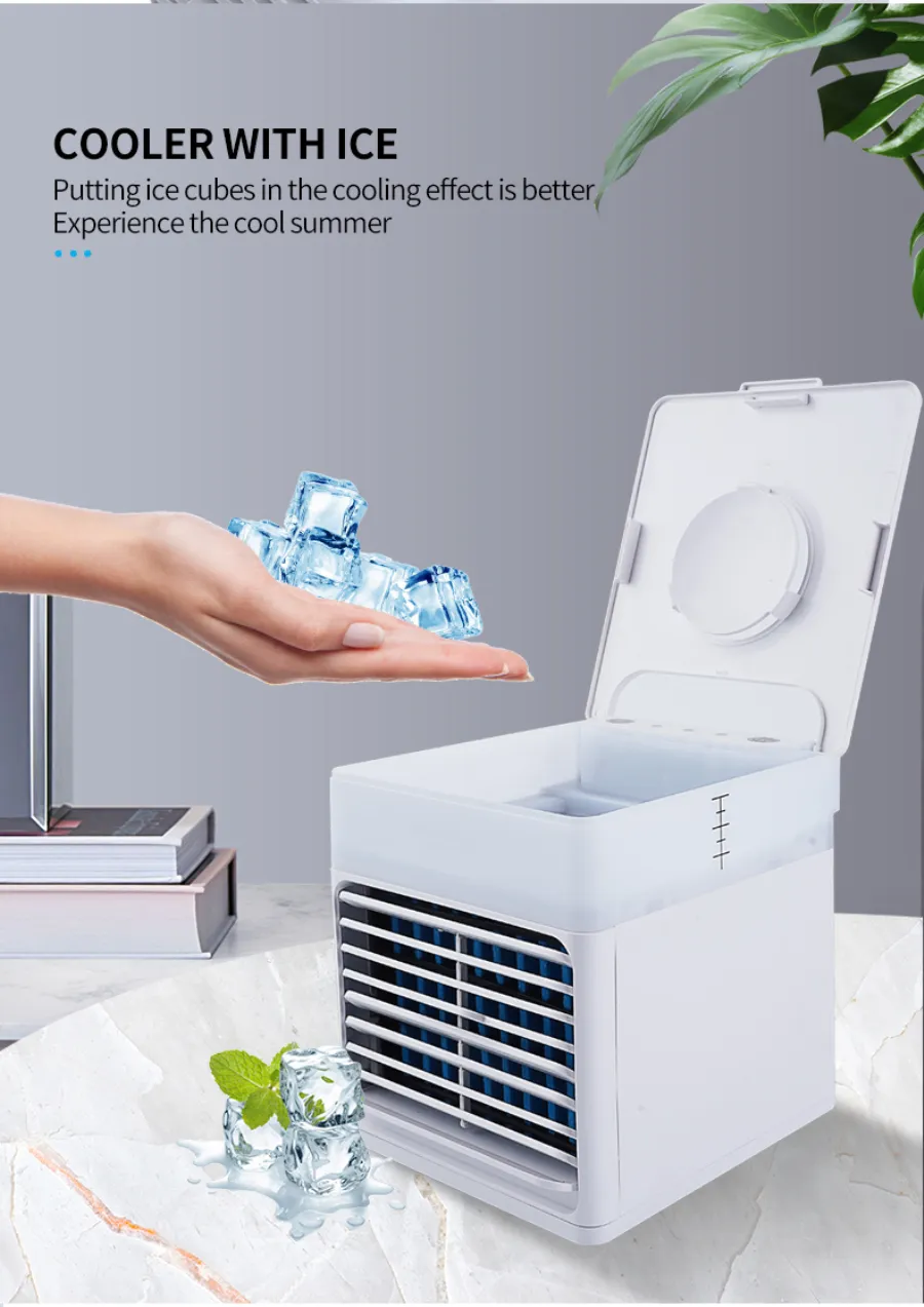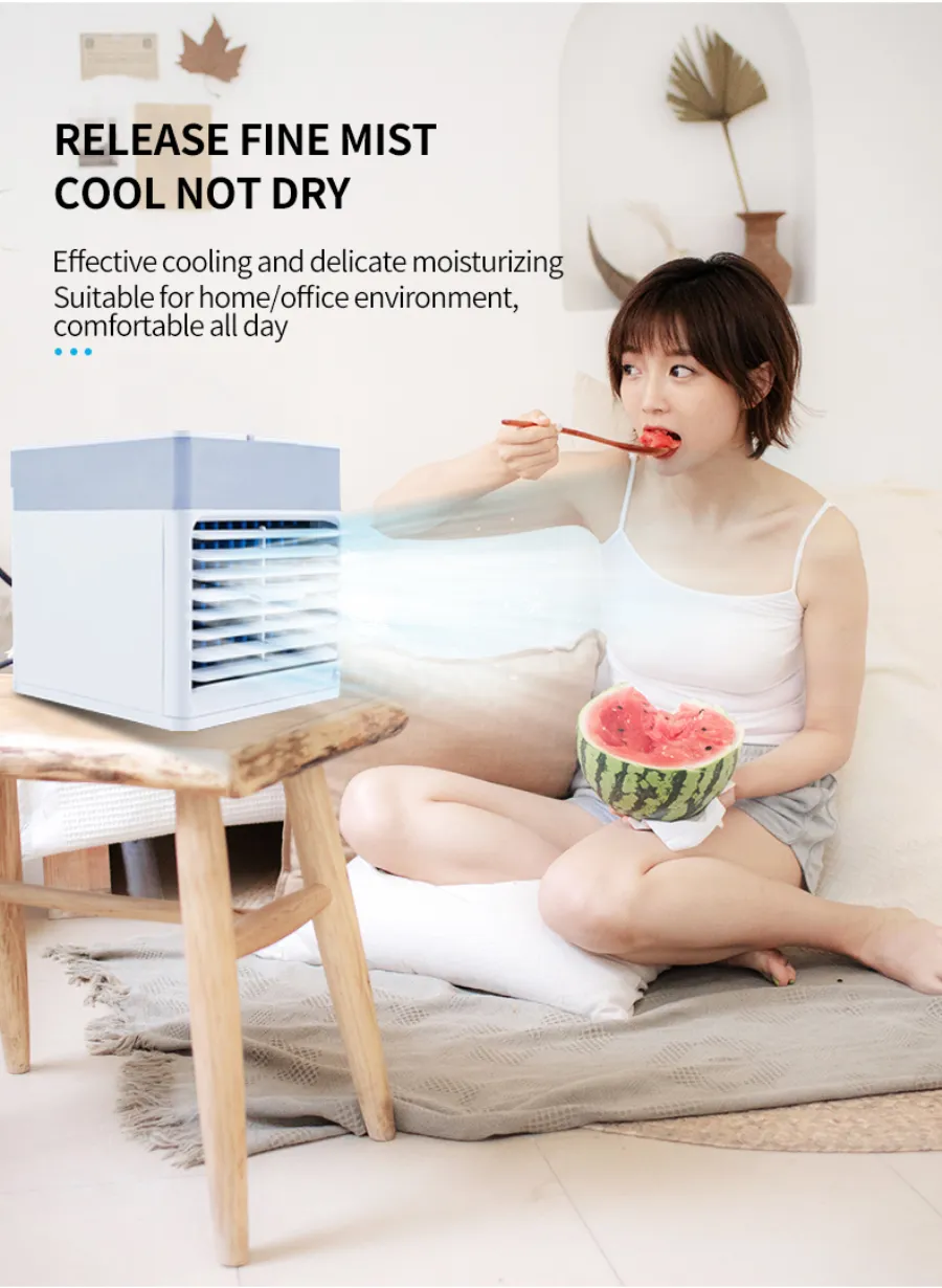 With its compact size and sleek design, this air cooler fits seamlessly into any space. Whether you're working at your desk, relaxing at home, or on the go, this air cooler ensures that you stay cool and comfortable throughout the day. Perfect for hot summer days, it provides a refreshing breeze that helps keep you cool without using up valuable energy or taking up too much space.