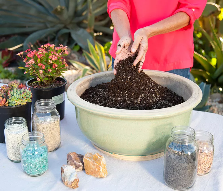 Fill the pot nearly to the top with cactus mix potting soil—it provides the amount of drainage succulents need. You can find a cactus mix for your succulent garden sold at any nursery or garden center.