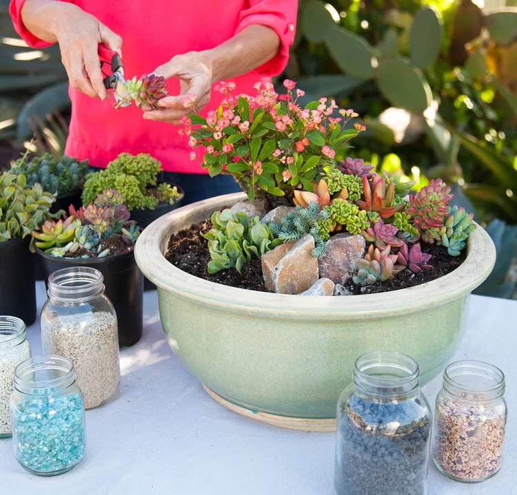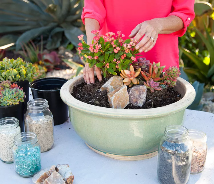 Tuck in small rooted succulents and cuttings so they appear to have grown among the rocks. Vary the plant colors and textures, and