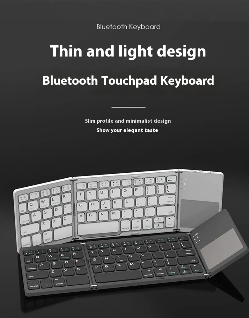 The Mini Tri-fold Bluetooth Keyboard Portable Thin Touch is a compact and stylish solution for those who need a highly portable and efficient typing tool while on the go. Its tri-fold design allows it to fit into even the smallest bags or backpacks, making it the perfect keyboard for travelers, professionals, or anyone who frequently works remotely. With Bluetooth connectivity, a touch-sensitive typing surface, and a thin profile, this keyboard is designed to offer maximum convenience and comfort in a portable format.