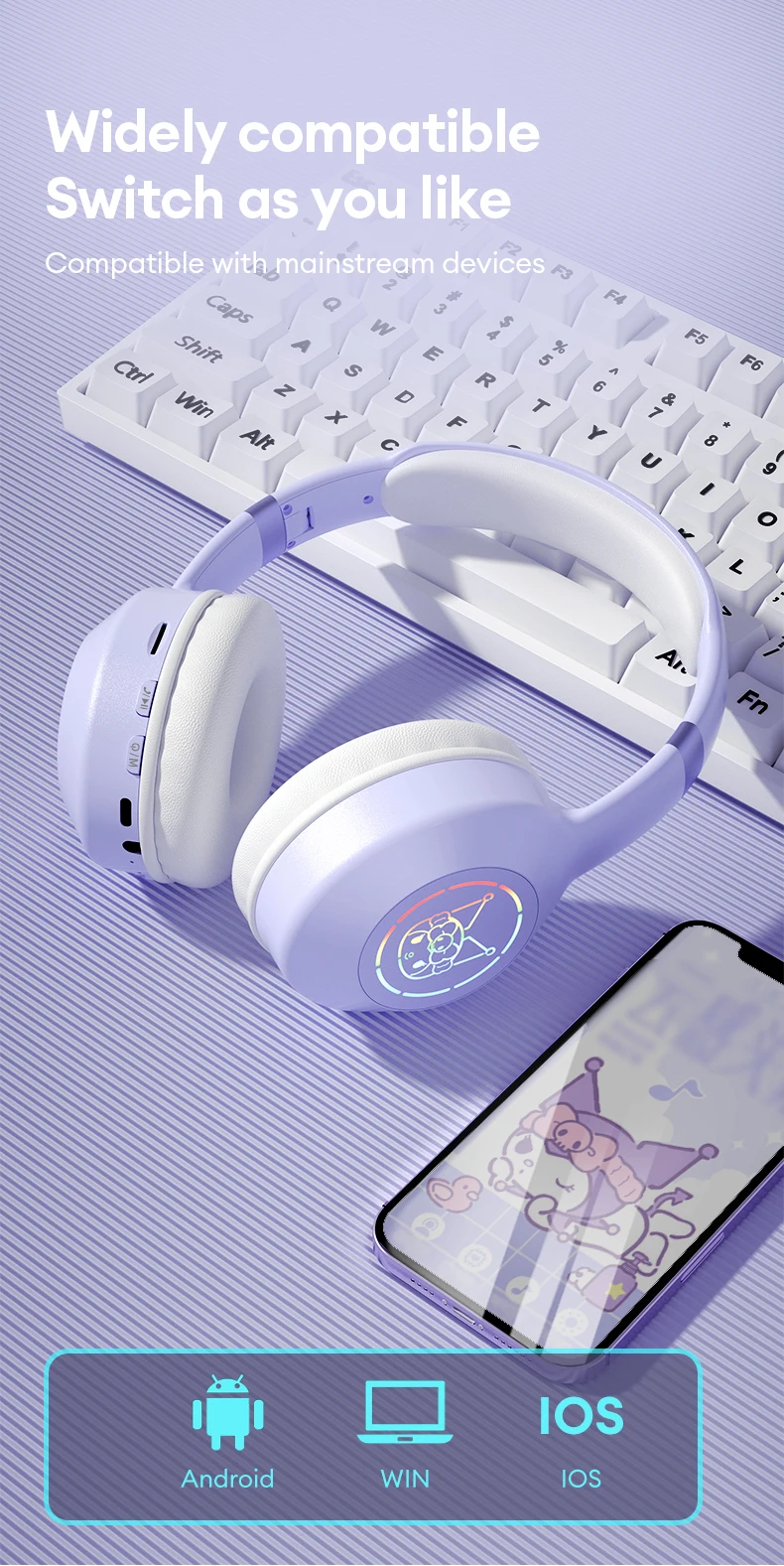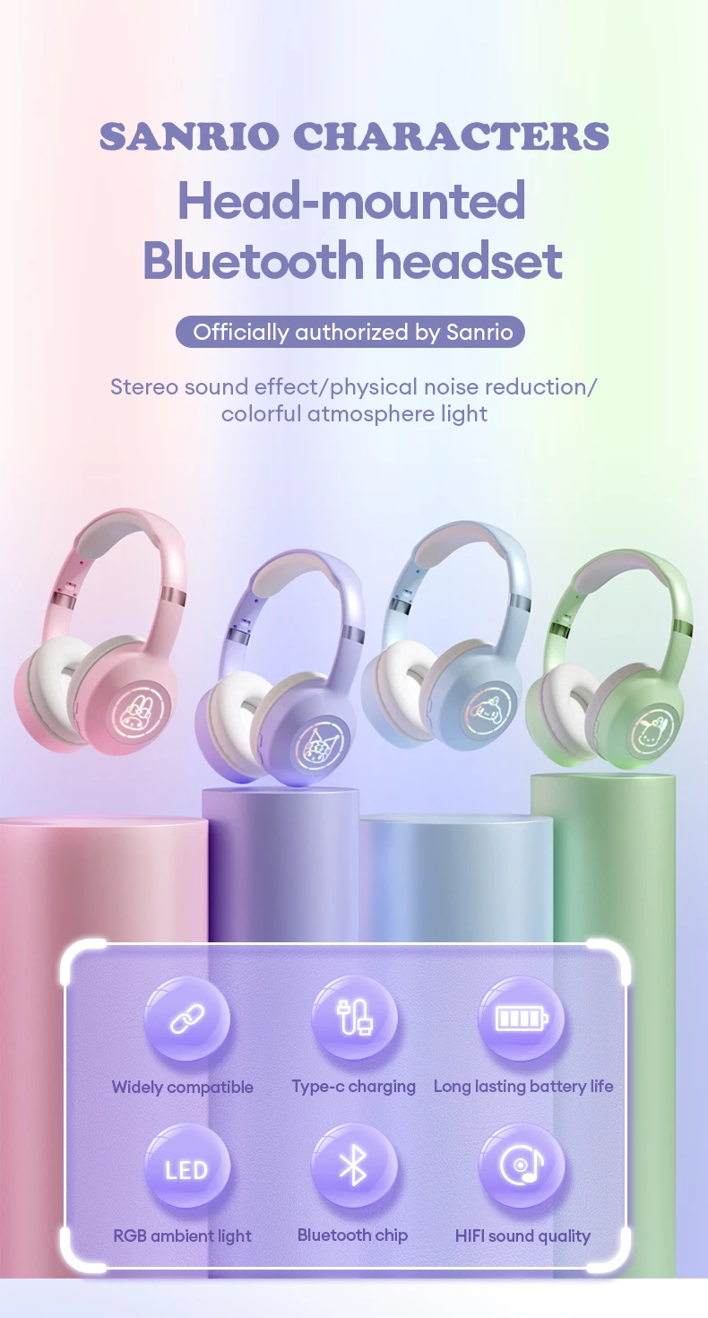The Miniso Sanrio EM-368 Bluetooth 5.2 Headphones offer a unique blend of high-quality audio performance and whimsical design. Perfect for fans of Sanrio characters, these wireless earphones come with exciting RGB light effects and feature designs inspired by Kuromi, Melody, and Hello Kitty. The combination of superior sound quality and playful aesthetics makes these headphones a perfect accessory for both everyday use and special occasions.