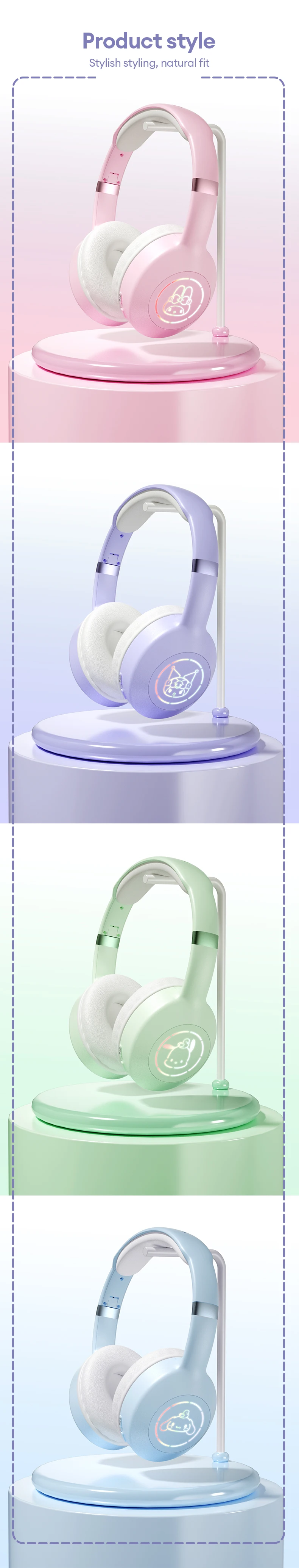 The EM-368 headphones are distinguished by their vibrant Sanrio-themed design. Each pair features iconic characters such as Kuromi, Melody, and Hello Kitty, making them a must-have for Sanrio enthusiasts. The earphones are equipped with dynamic RGB lights that illuminate in various colors, adding a fun visual element to your listening experience. The sleek and stylish design ensures that these headphones are not only functional but also a fashionable accessory.